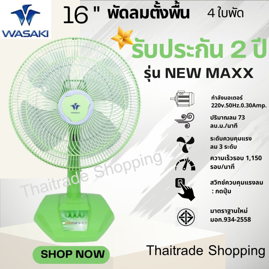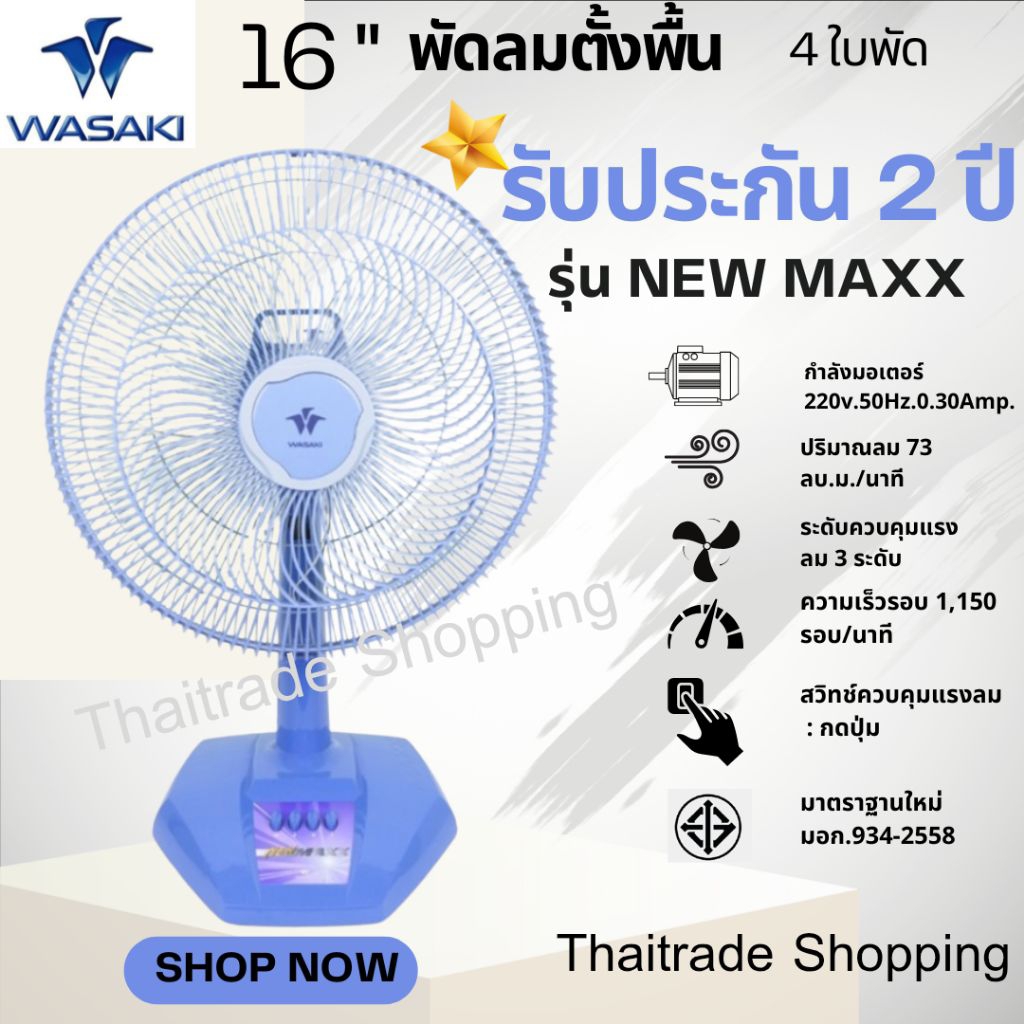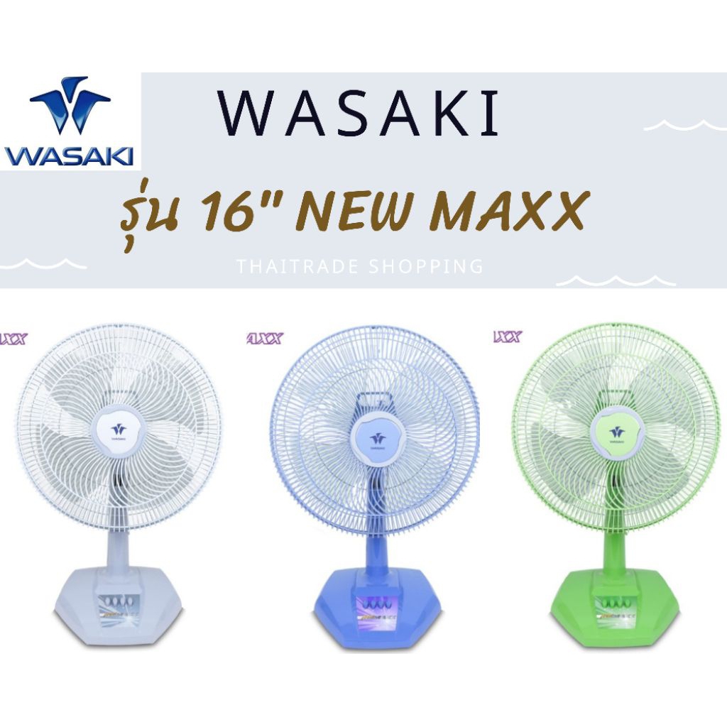 พัดลมตั้งโต๊ะ16นิ้วยี่ห้อวาซากิ(WASAKI)รุ่น New Maxx 4ใบพัดให้ลมแรงกว่าผลิตประกอบในโรงงานไทยมีมอก.934-2558รับประกัน2ปี