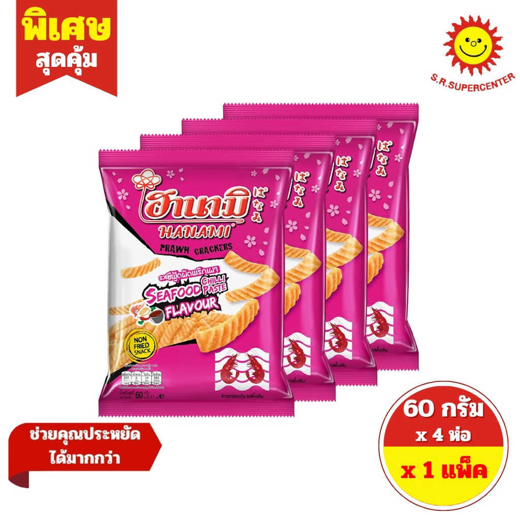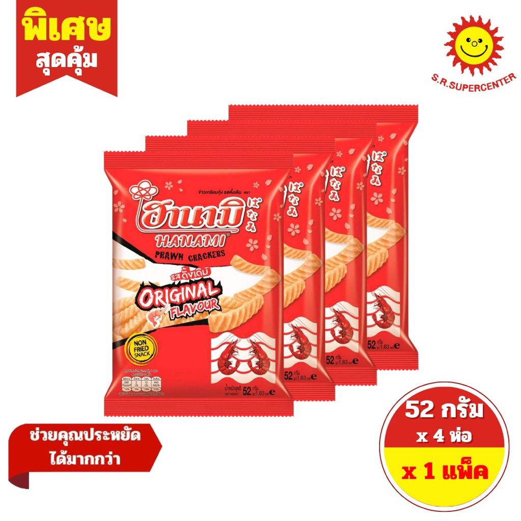 [ 1 แพ็ค ] Hanami ฮานามิ ข้าวเกรียบกุ้ง ห่อ20บาท ขนาด 52-60 กรัม x 4 ห่อ 5 รสชาติ