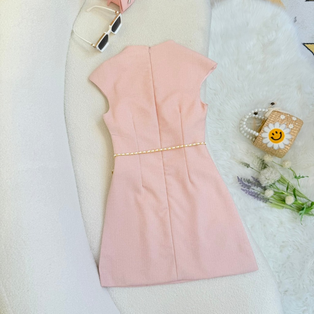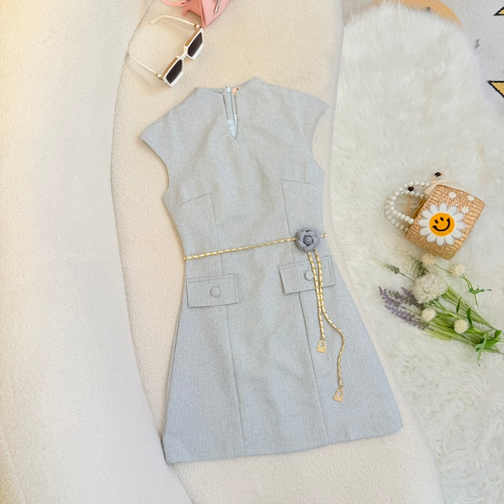 [LISA] A1306 ชุดเดรสกระโปรงคอจีนแขนกุดแต่งกระเป๋าเข็มกลัดดอกไม้สายโซ่ ผู้ดีใส่เที่ยว ออกงาน ดินเนอร์