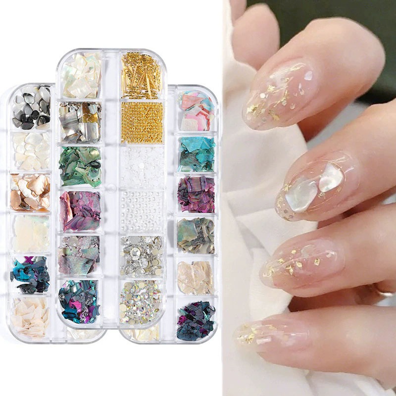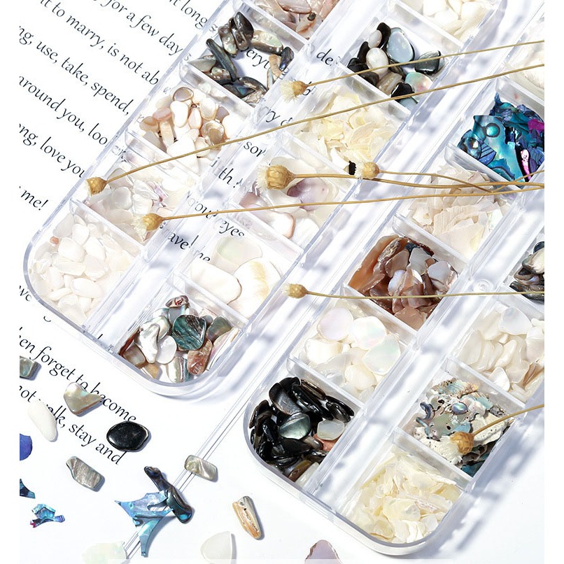 เครื่องประดับเปลือกหอย อุปกรณ์ตกแต่งเล็บ คริสตัล 3D ทรงพิเศษ Diy 12ช่องมี สำหรับติดตกแต่งเล็บ