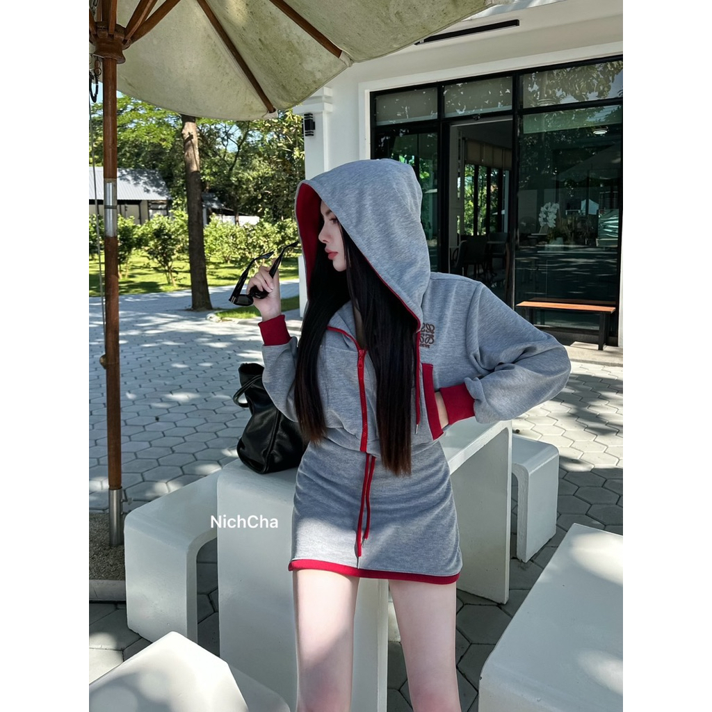 Phapassz - Set2ชิ้น เสื้อแขนยาวซิปหน้าฮู้ด กระเป๋าข้างทูโทนแต่งโลโก้ กระโปรงสั้นซับกางเกง มีเชือก สาวเท่ๆ #Nicha