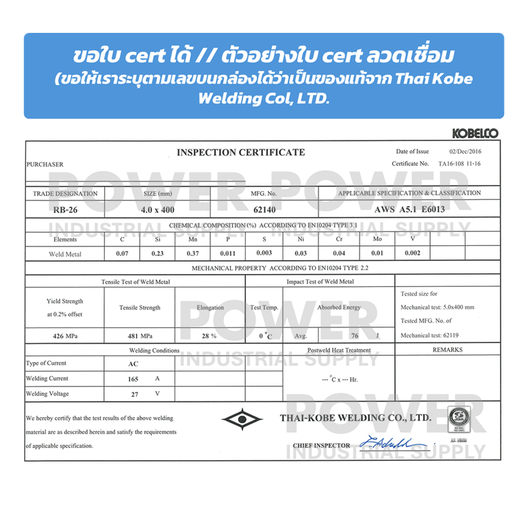 Kobelco RB-26 (กล่องเล็ก 2kg /5 kg) ลวดเชื่อมแท้ 2.6 / 3.2 / 4.0 ของแท้ 100% ออกใบกำกับภาษีได้ ส่งด่วน Power Kobe