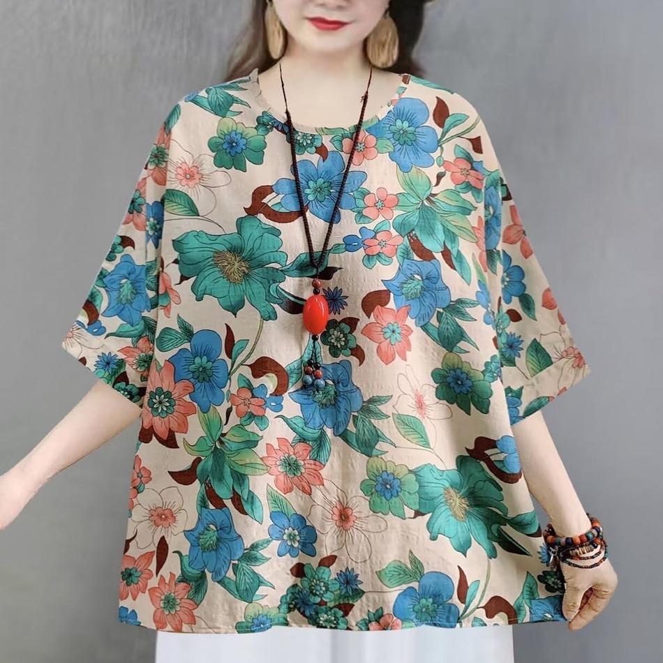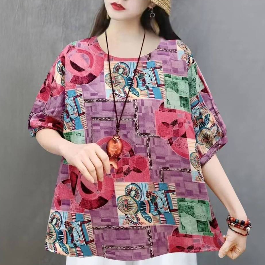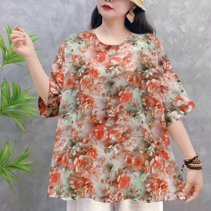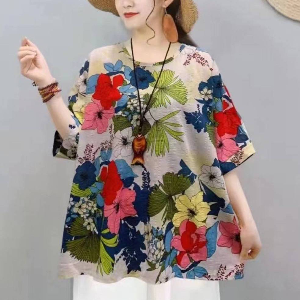 เสื้อแขนสั้นผู้หญิง พิมลายดอกสวยๆ เสื้อใส่สงกรานต์ {อก 50 นิ้ว} ผ้าฝ้ายไม่ยืดบางเบา พร้อมส่ง C1