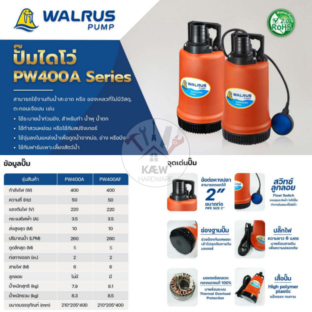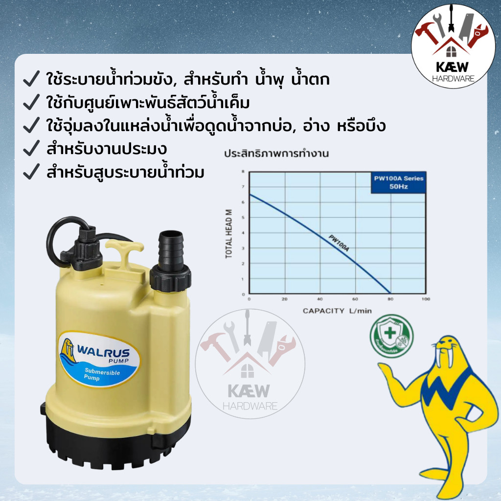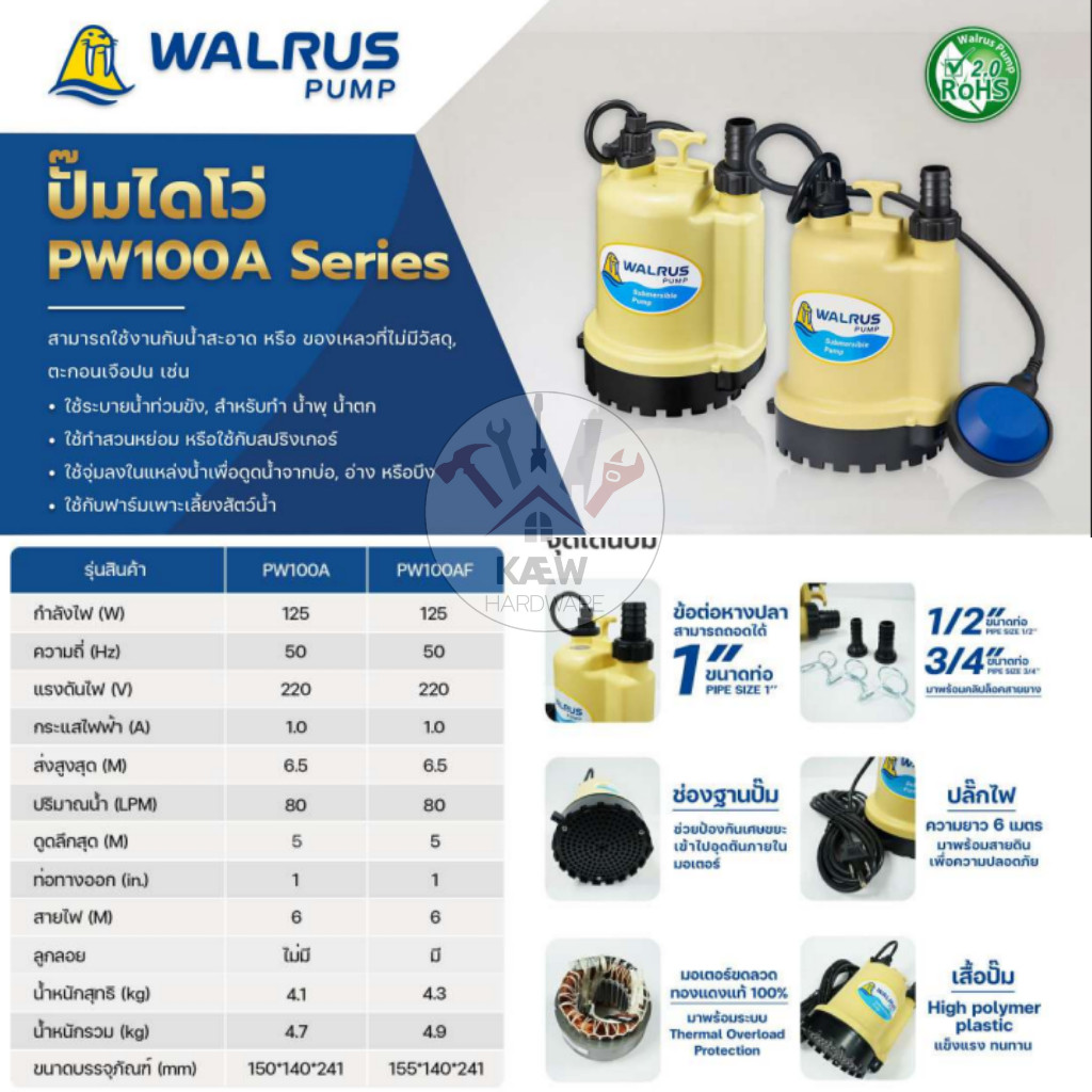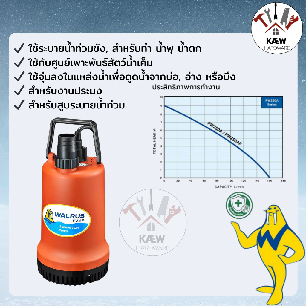 WALRUS ปั้มจุ่ม ไดโว่ ปั๊มแช่ 125W 250W 400W ขนาดท่อ 1" 1.5" 2" รุ่น PW100A PW250A PW400A ดูดน้ำสะอาด ทำน้ำพุ น้ำตก