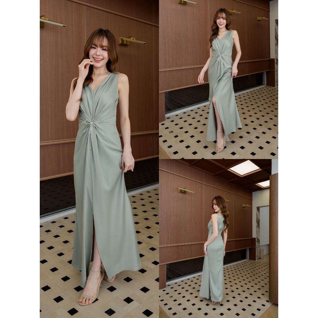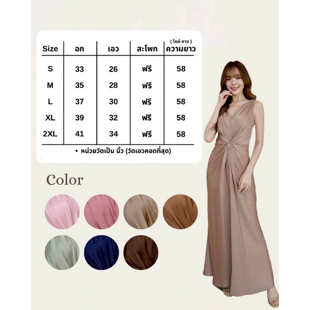 ชุดออกงาน ชุดเพื่อนเจ้าสาว koolykool กล้ามคอวีรวบไหล่รวบเอวผ้าเครบซาตินแถมเข้มกลัดโบว์เพชร THN00