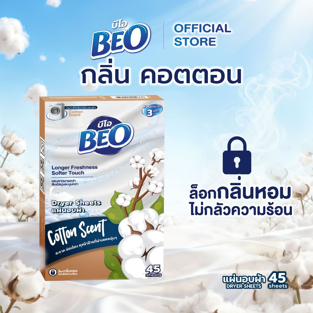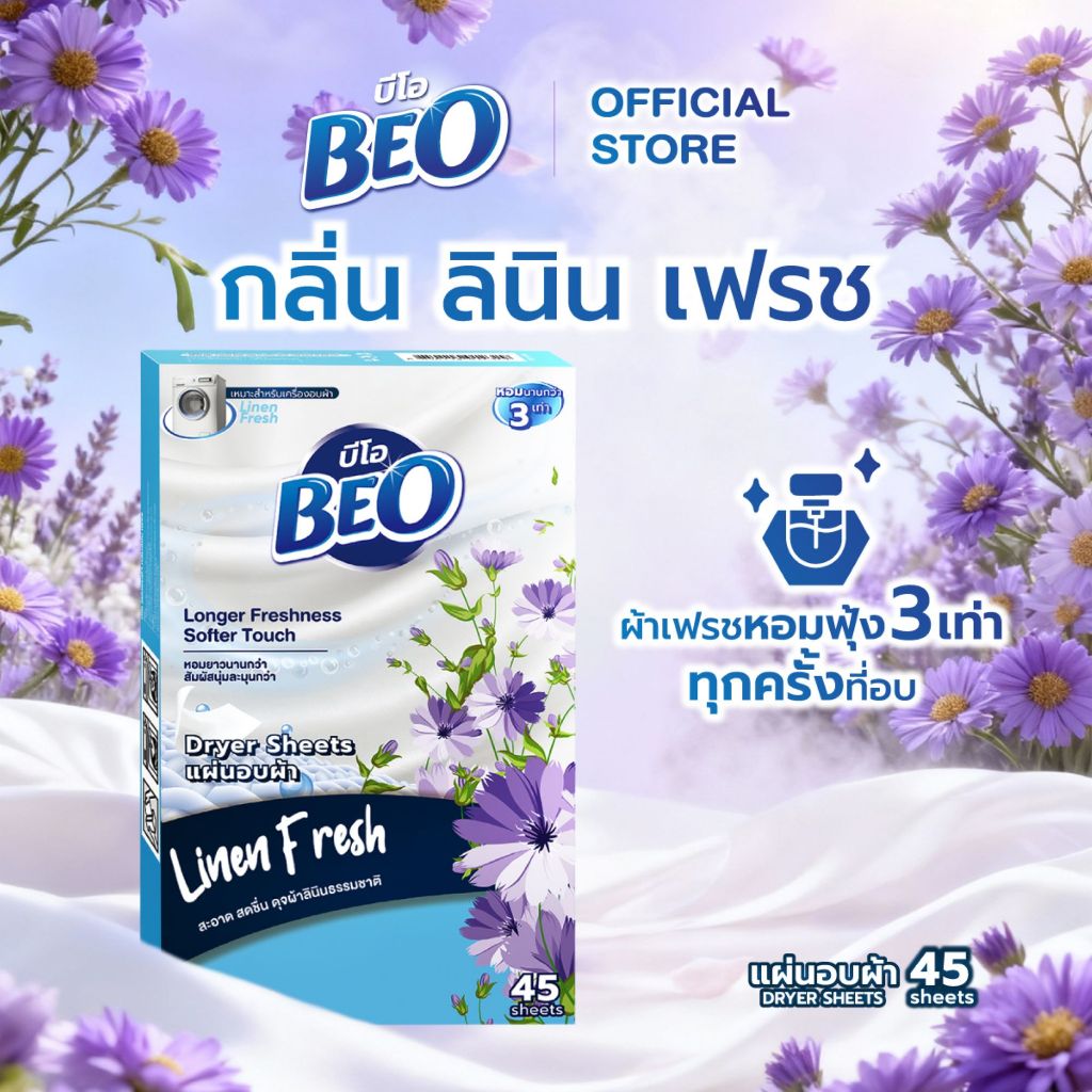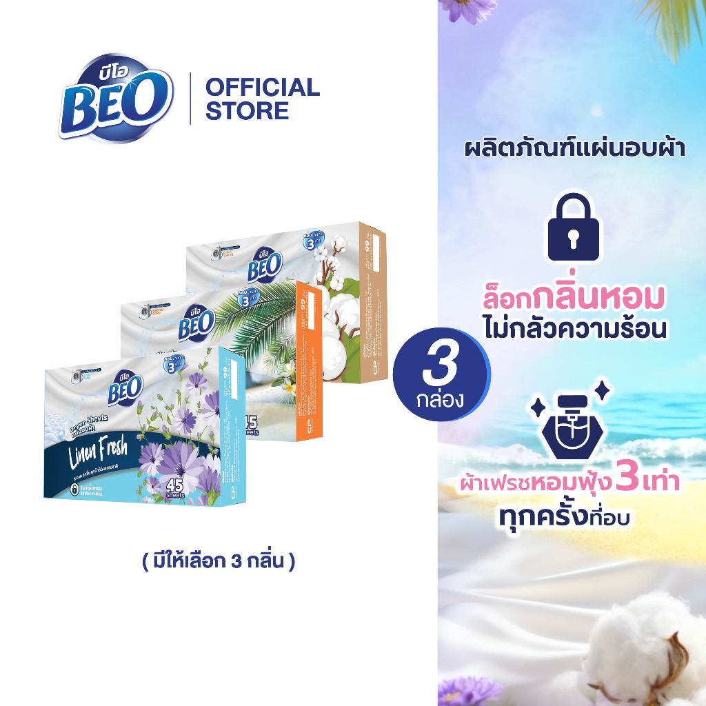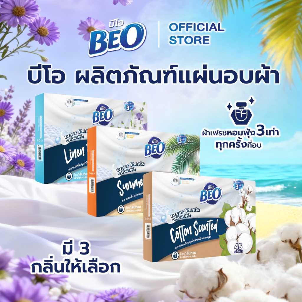 BEO Dryer Sheets บีโอ แผ่นอบผ้า กล่อง 45 แผ่น (มีให้เลือก 3 กลิ่น) x3