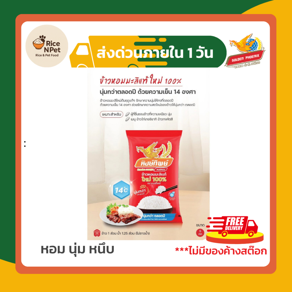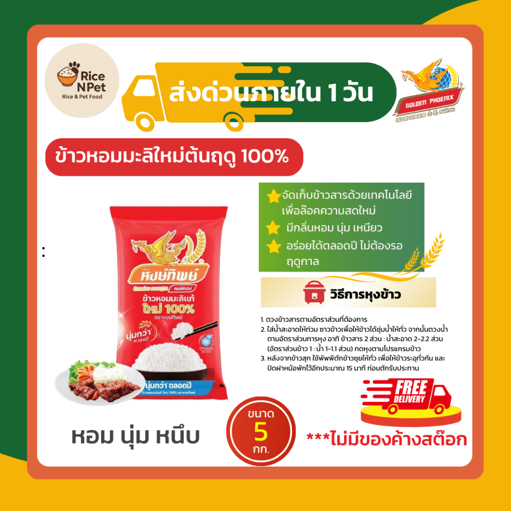 หงษ์ทิพย์ ข้าวหอมมะลิใหม่ 100% ขนาด 5 กิโลกรัม ข้าวหอมมะลิแท้ หอม นุ่ม หนึบ
