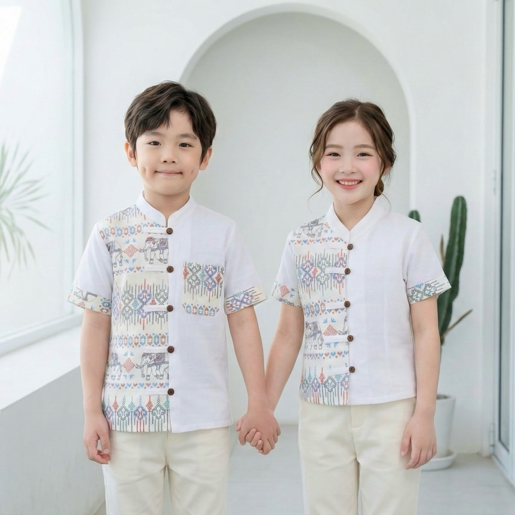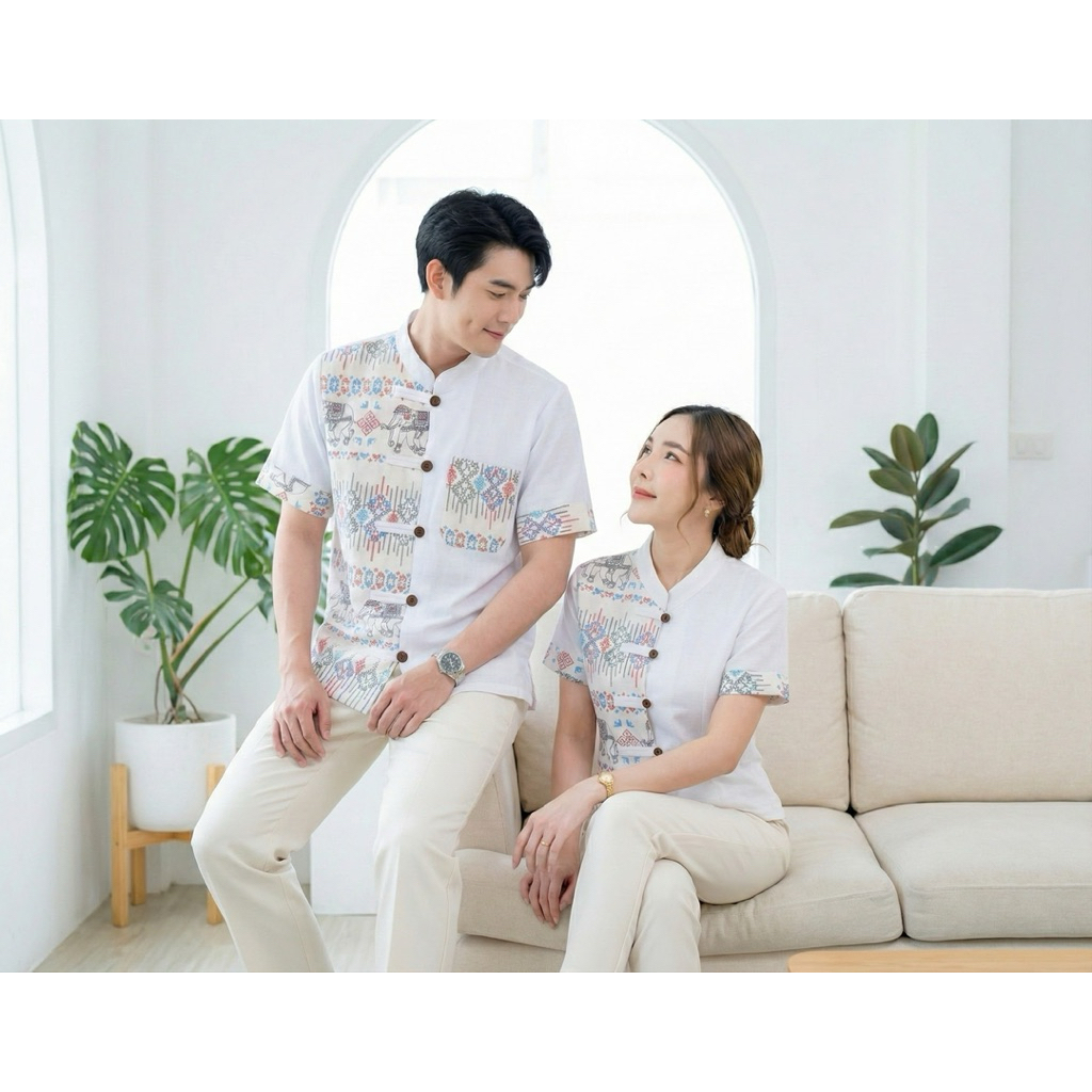 เสื้อพื้นเมืองคู่ ชาย/หญิง ทูโทนลายช้างขาวสี มีทั้งผู้ใหญ่และเด็ก