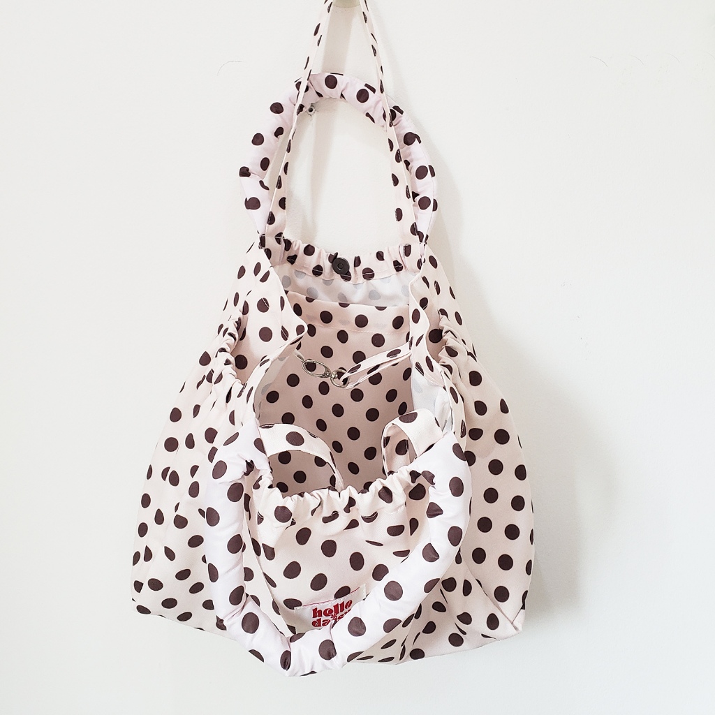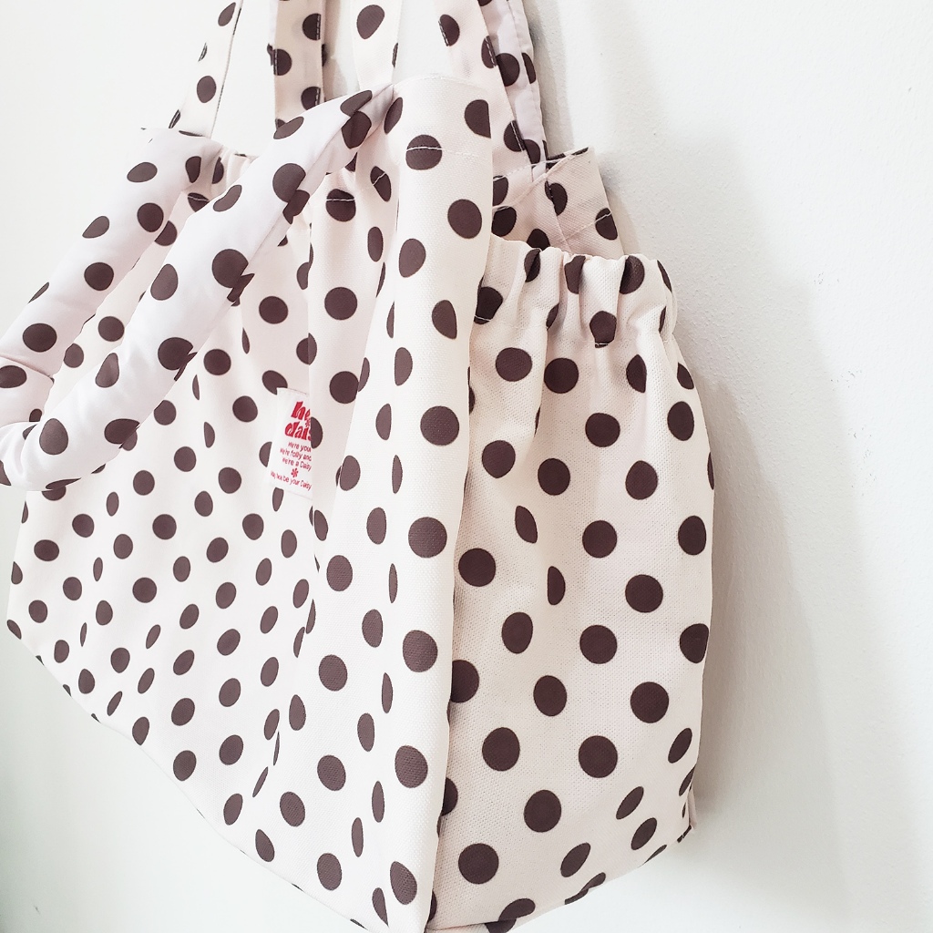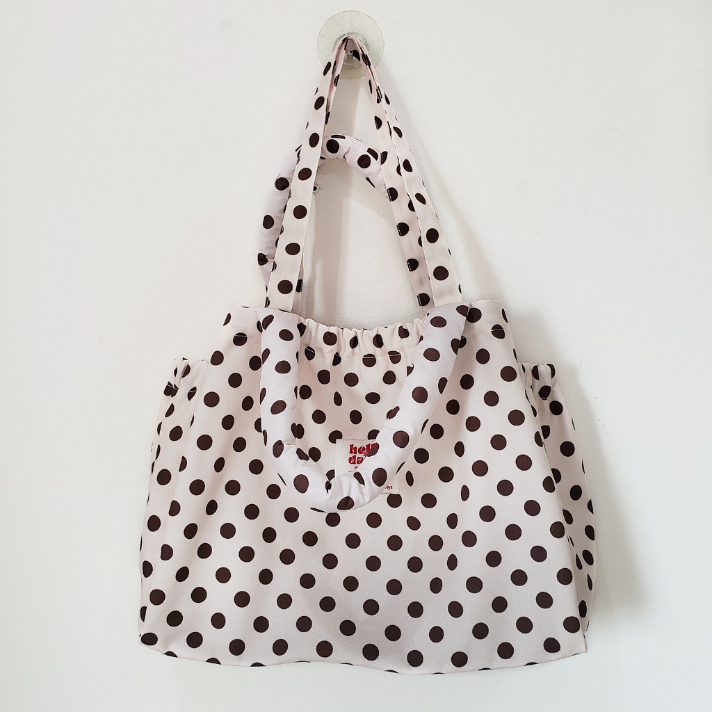 [พร้อมส่ง] Hello Daisy- Pumpkin bag - XL พื้นสีครีมลายจุดน้ำตาล มีช่องข้างใส่ขวดน้ำ ปากกระเป๋ารูดย่นยางยืด