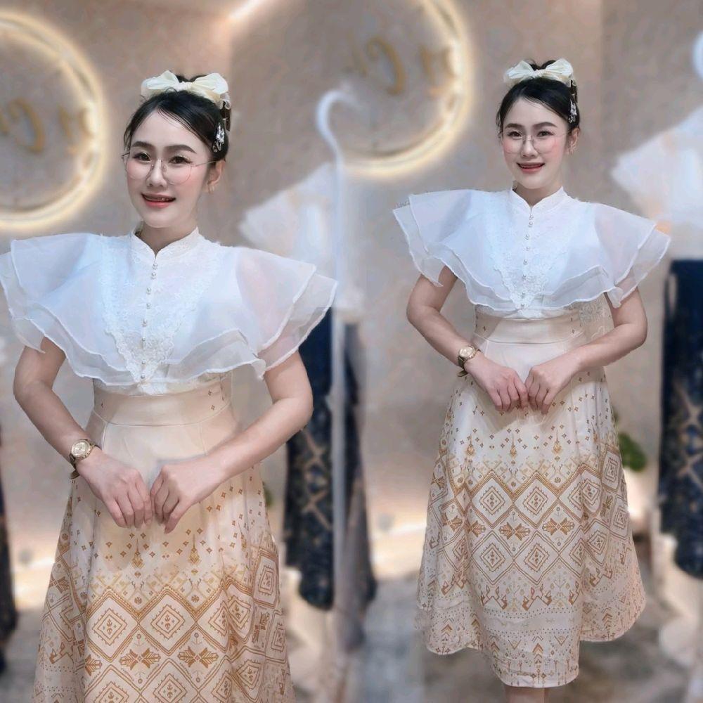 P115 ชุดเดรสไทยประยุกต์ ฟรีไซส์ ML ผ้าบาร์บี้พิมพ์ลาย คอจีน ลูกไม้ปัก แขนระบาย 2 ชั้น ใส่ซับในโฟรเวย์ ชุดไทยสำหรับงานบวช