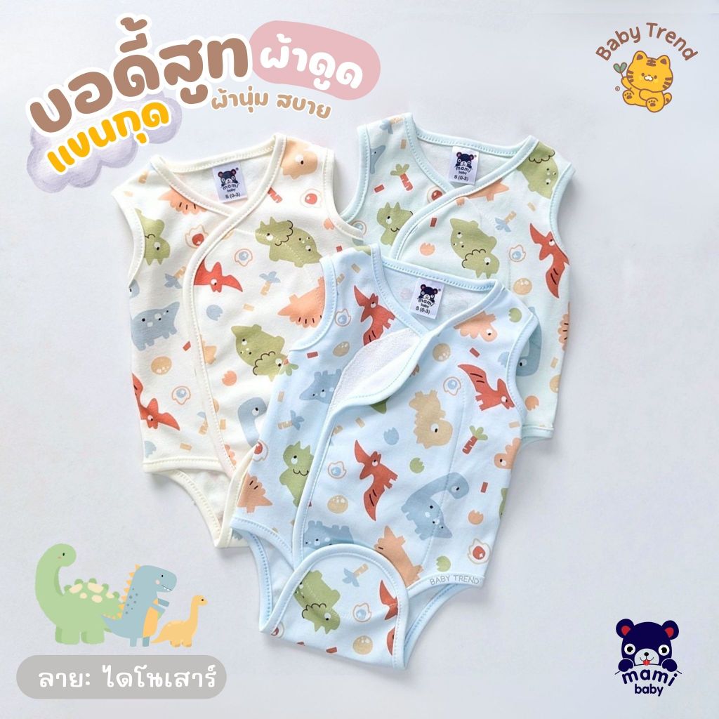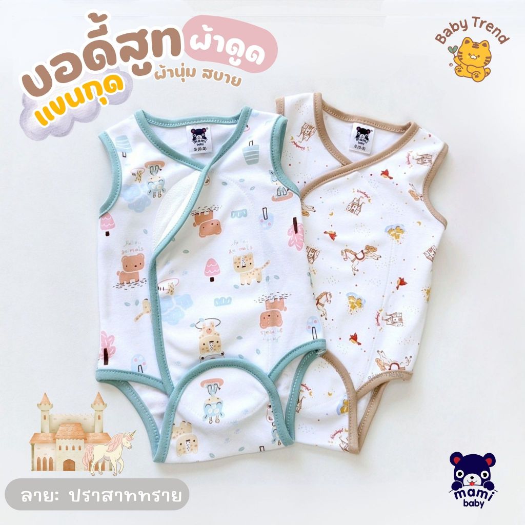 Mami Baby ชุดบอดี้สูทผ้าดูด "แขนกุด" ขาเว้า ไร้ซืป ไร้กระดุม ไร้เชือก ลายน่ารัก ผ้าคอตตอนนุ่มๆ