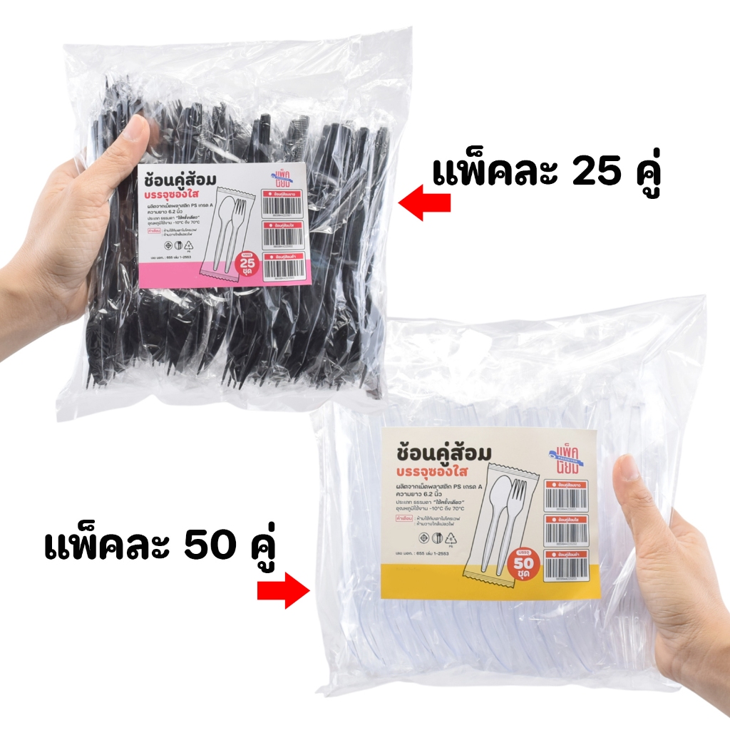ช้อนคู่ส้อมพลาสติก ห่อฟิล์มแพ็คคู่ สีใส , สีขาว , สีดำ