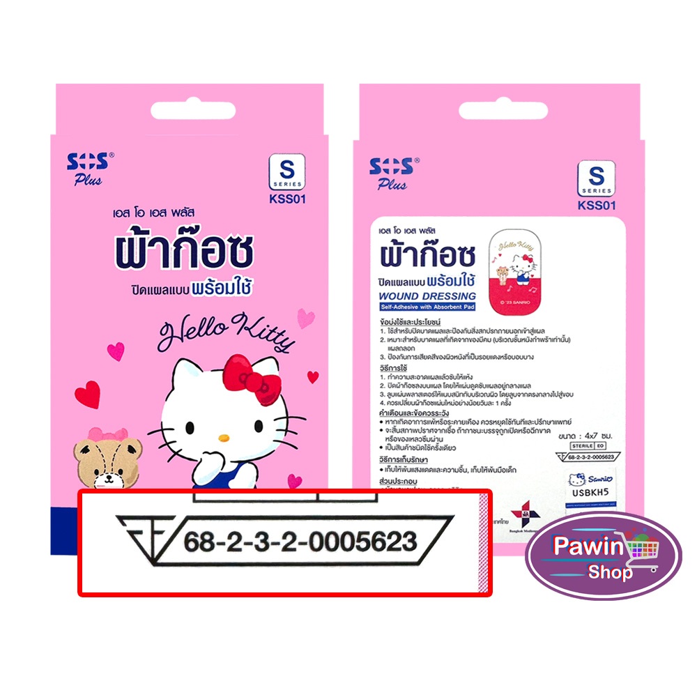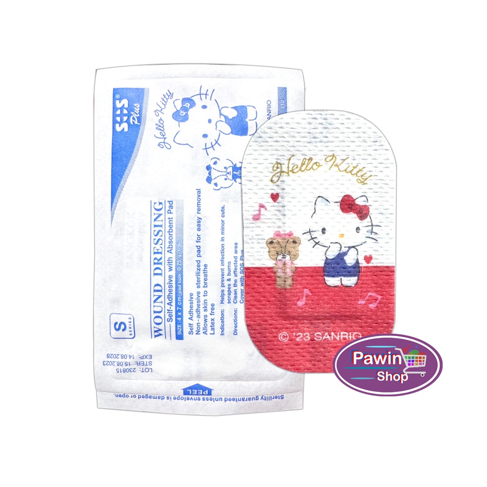 SOS Plus Hello Kitty S KSS01 ผ้าก๊อซ ปิดแผลแบบพร้อมใช้ ลายเฮลโล คิตตี้ ขนาด 4x7 ซม 4 แผ่น [1 กล่อง] GG 5311