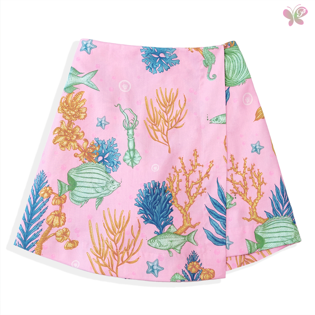 กางเกงกระโปรงผู้หญิง Papillon]Women Yuri Shorts ผ้าCotton Rayon Twill เอวสูง ซิปข้าง ยางยืดหลัง พิมพ์ลายปลา Les Poissons