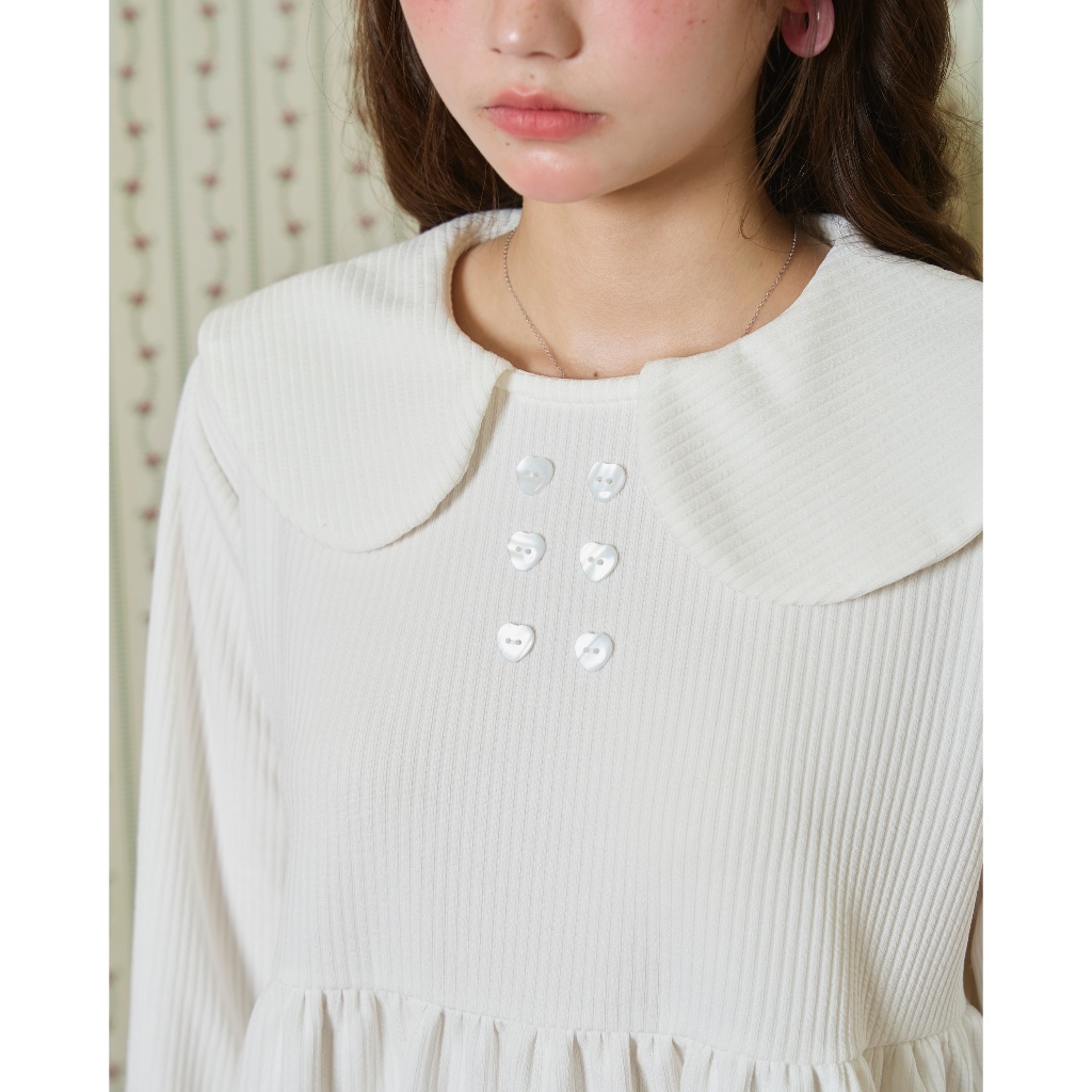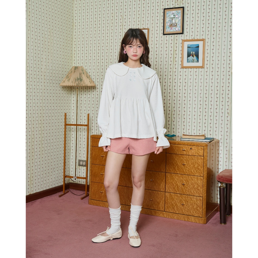 Panchitar Princess Heart – เสื้อสีขาวทรงหวาน คอบัว ดีเทลแขนเสื้อสม็อก ใส่สบาย ไม่รัด กระดุมหัวใจ