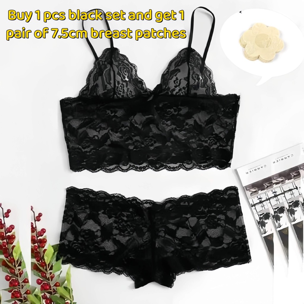 ชุดบราเซ็กซี่ สายเอี๊ยมลูกไม้ กางเกงชั้นในสามจุด ซื้อบราสีดำ 1 ชิ้น แถมฟรี แผ่นแปะหน้าอก 7.5 ซม. 1 คู่ MOLISA