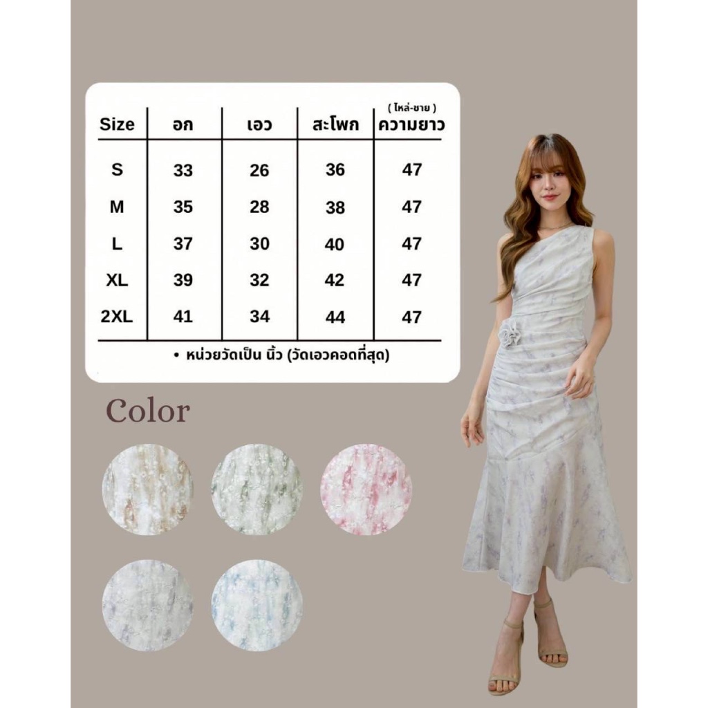 ชุดออกงาน ชุดเพื่อนเจ้าสาว koolykool ไหล่เบี่ยงรูดทั้งตัวชายกระโปรงย้วยผ้าลายแถมเข้มกลัดดอกไม้ THL00