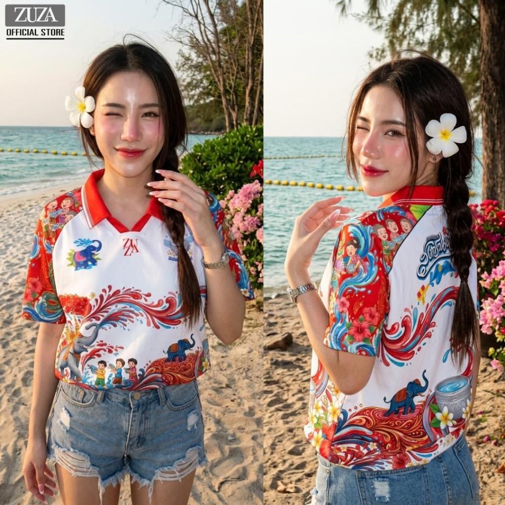 ZUZA - THAI NEW YEAR เสื้อคอปก โปโล พิมพ์ลาย “ ไทยนิวเยียร์ ” ใส่ได้ทั้งชายหญิง. ผ้าไมโครโพลีเอสเตอร์ ใส่สบายตลอดวัน.
