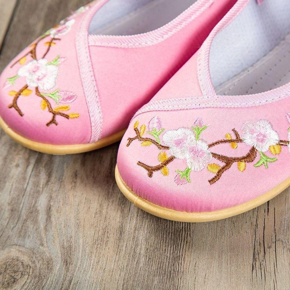 รองเท้าเต้นเด็กผู้หญิง สไตล์ชาติพันธุ์ ดอกไม้ Soft Sole สะatิน ใส่สบายสำหรับการฝึกหัด