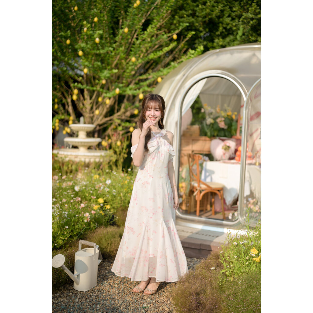 Fay Off-Shoulder Maxi Dress : ลายดอกไม้บนพื้นสีครีมอ่อน
