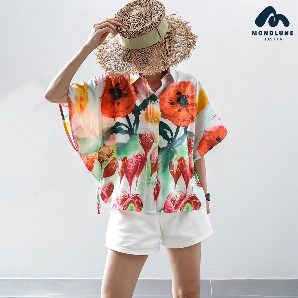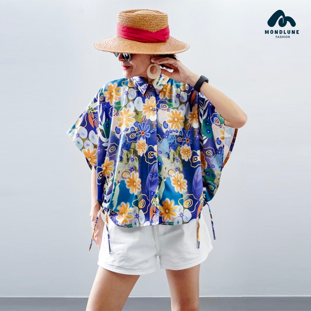 #4181 MondLune เสื้อเชิ้ตคอปก แขนปีกค้างคาว มีเชือกรูดข้าวเอว ปรับความยาว ผ้าไหมอิตาลี100D เกรดดี