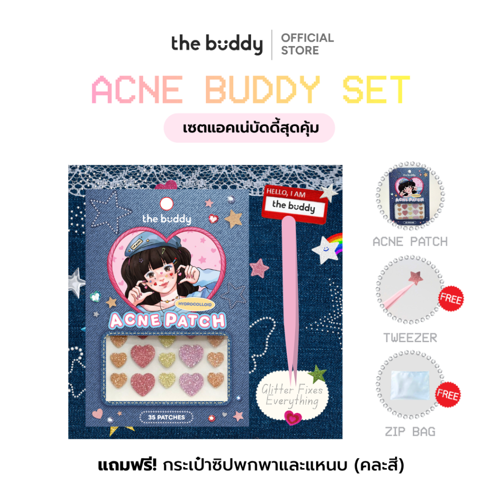 แผ่นแปะสิวเดอะบัดดี้ The Buddy Acne Patch ชนิดไฮโดรคอลลอยด์ แผ่นแปะสิวกลิตเตอร์ดาวหัวใจ 35 ชิ้น/ซอง