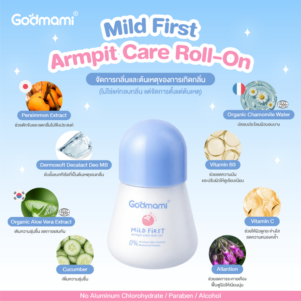 [สูตรใหม่] Godmami โรลออนเด็ก 0% Aluminum สูตรอ่อนโยน ไร้สารส้ม ระงับกลิ่นตั้งแต่ต้นตอ 12 ชม. สำหรับเด็กและผิวแพ้ง่าย