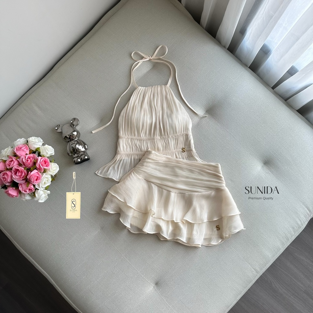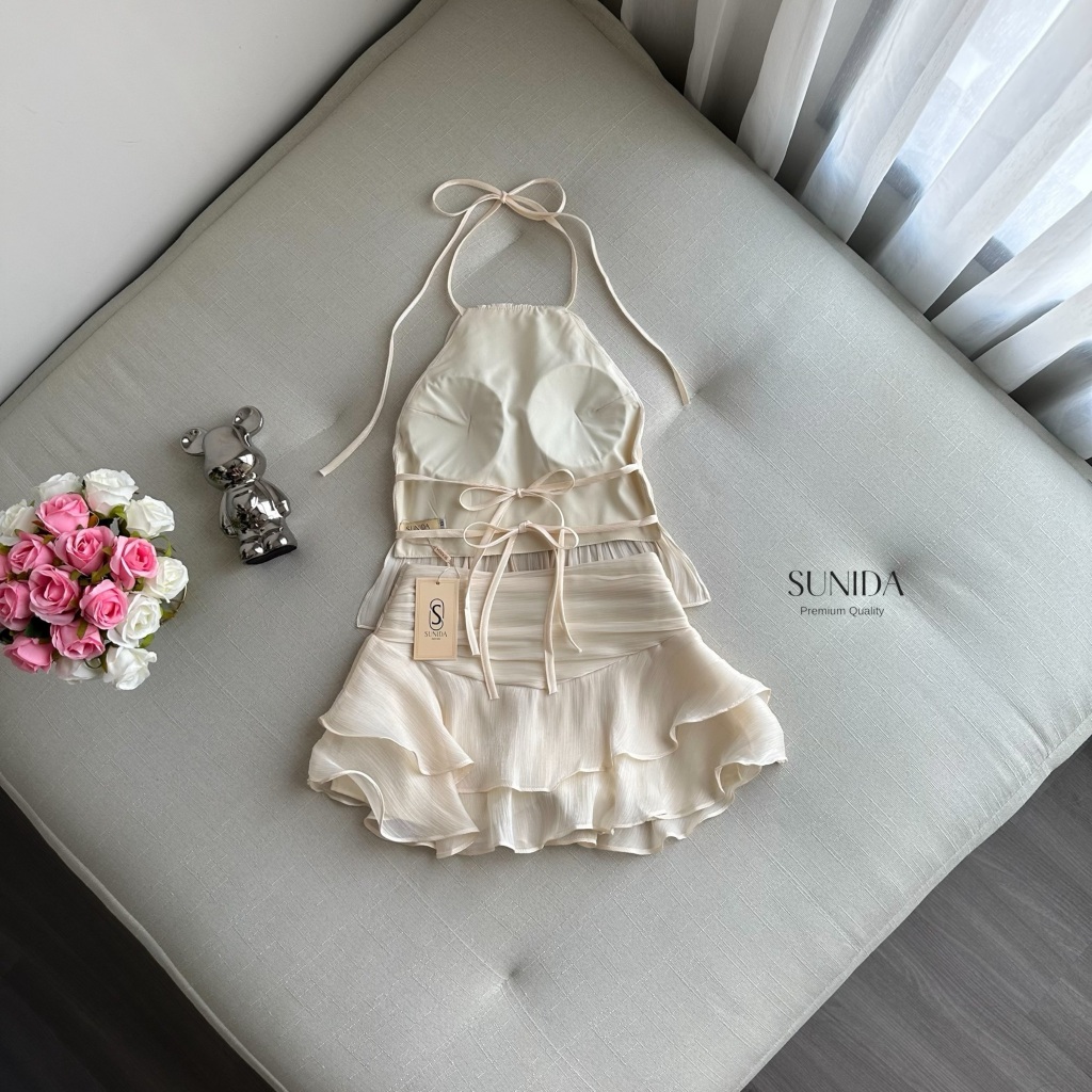 Sunida- ชุดเซต สี Champagne Gold เสื้อผูกคอผูกหลังหน้าอกเสริมฟองนม+ กระโปรงมีซับในกางเกง
