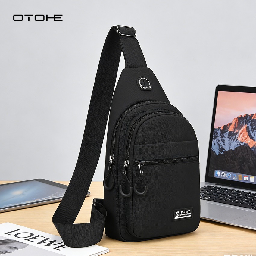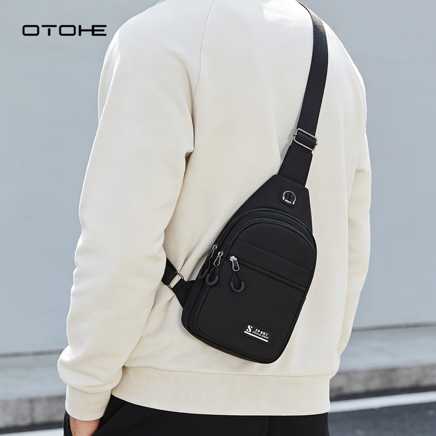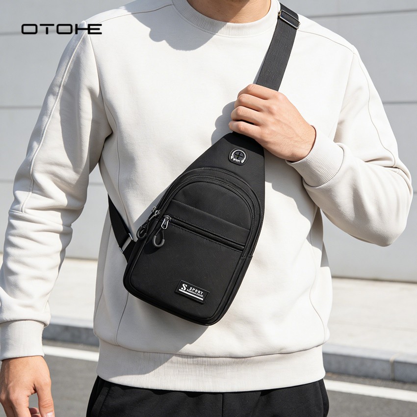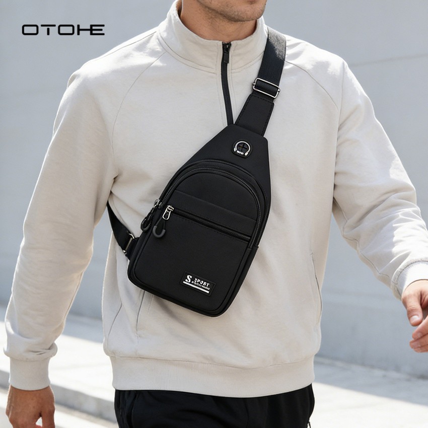 OTOHE กระเป๋าคาดหน้าอกผู้ชายกันน้ําหลายช่องกระเป๋าเดินทางข้ามร่างกายกระเป๋าหูฟังการออกแบบรูสําหรับนักศึกษาวิทยาลัย