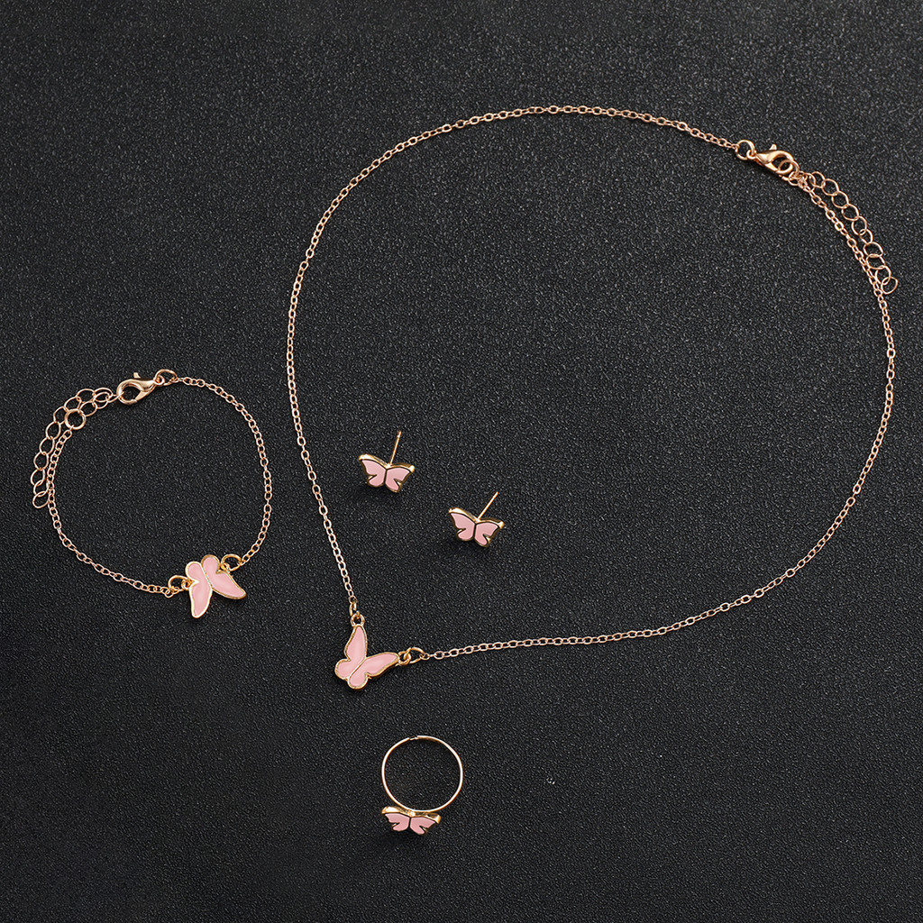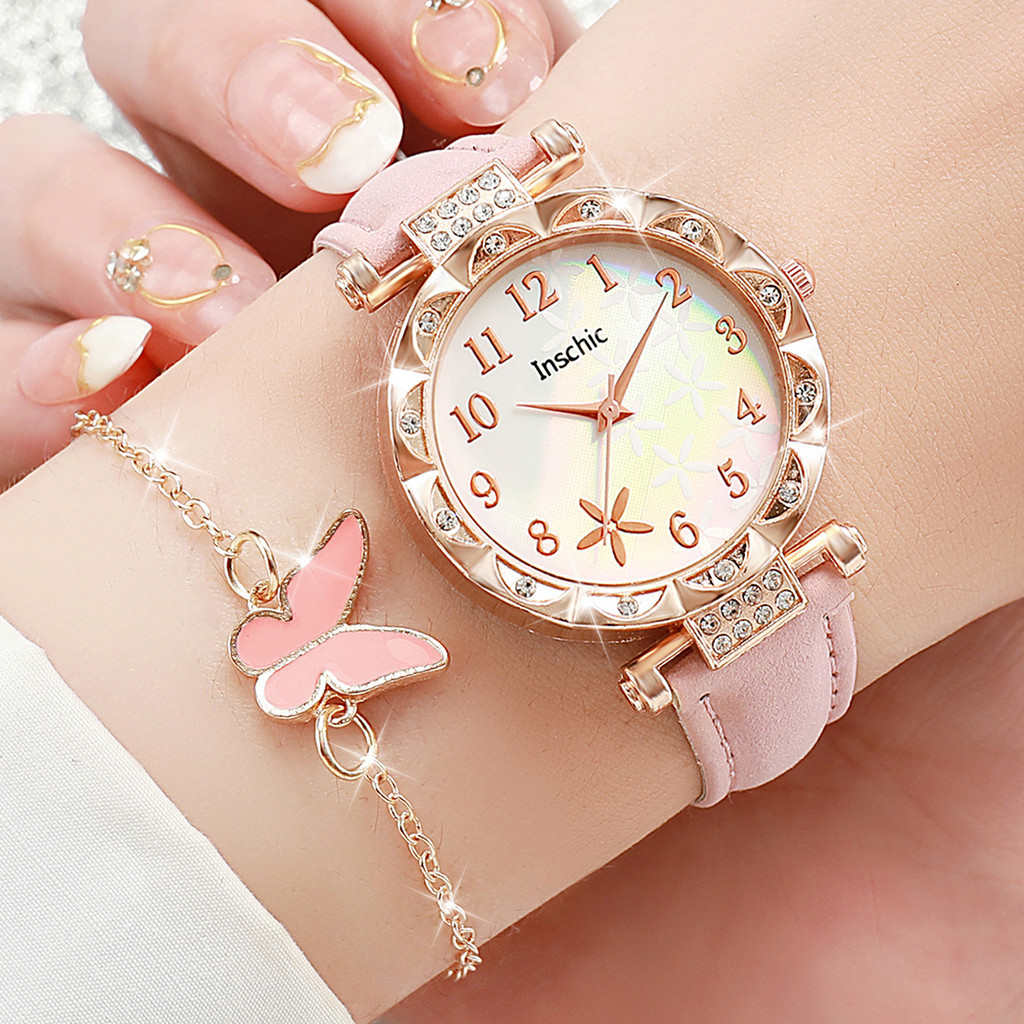 6ชิ้นแฟชั่นดอกไม้หน้าปัดผู้หญิงนาฬิกาผีเสื้อชุดเครื่องประดับหนังวงนาฬิกาข้อมือควอตซ์ (กล่องไม่มี)
