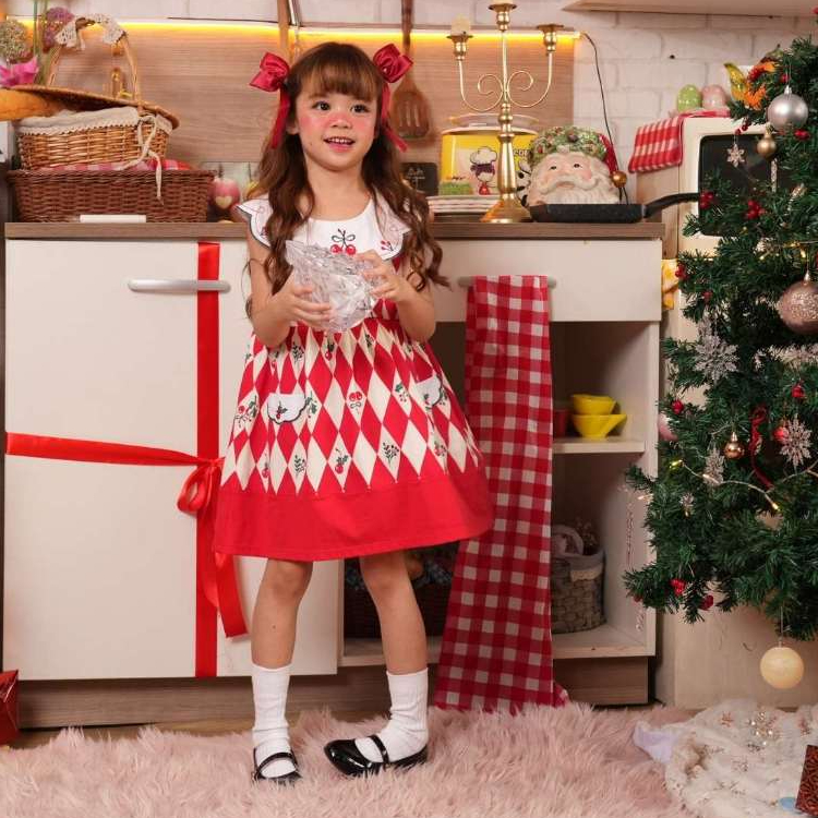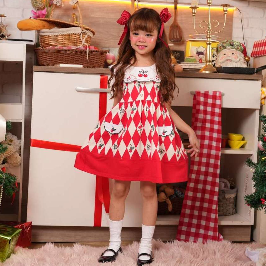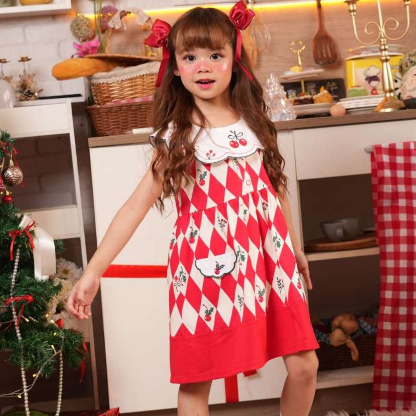 Chelsee ชุดเดรสกระโปรง มีปก ลายเชอร์รี่ ผ้า 100%Cotton เด็กผู้หญิง อายุ 1.5-10ปี เสื้อผ้าเด็ก รุ่น 238214