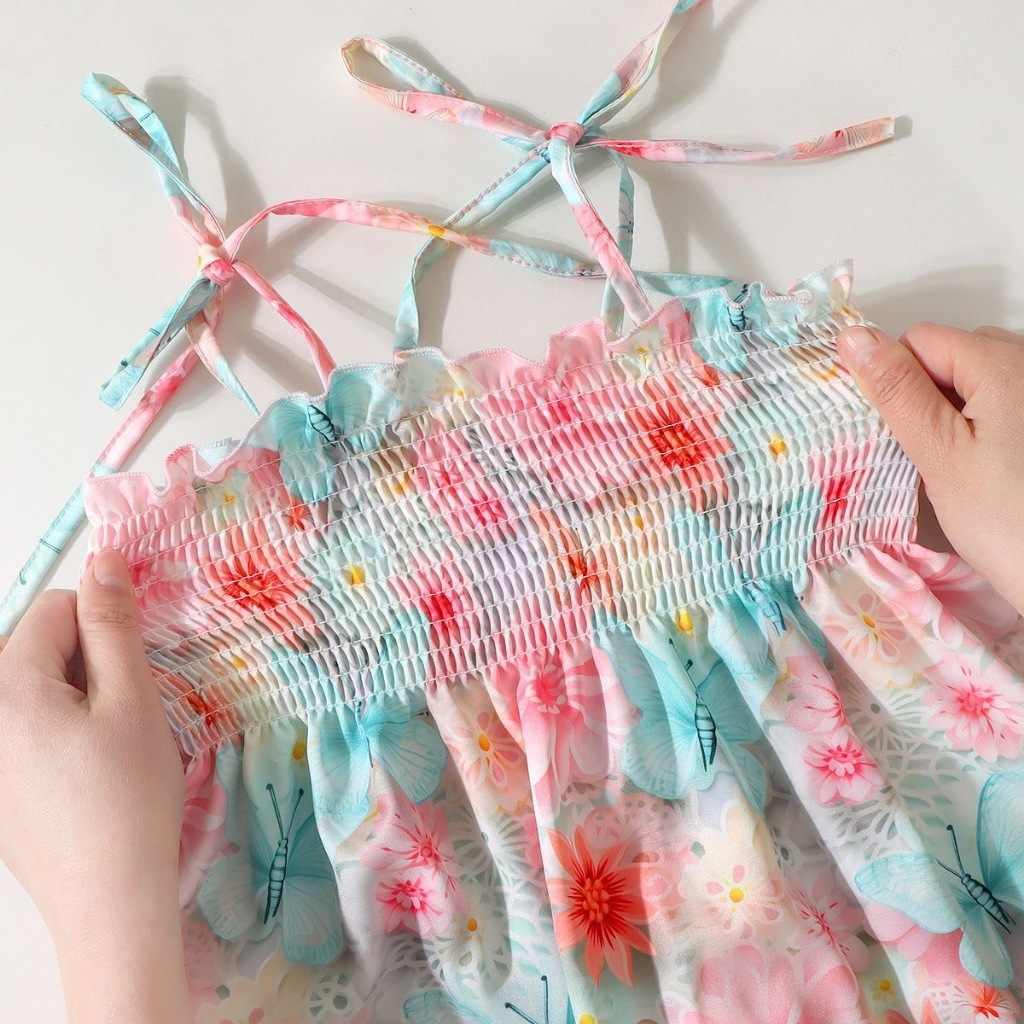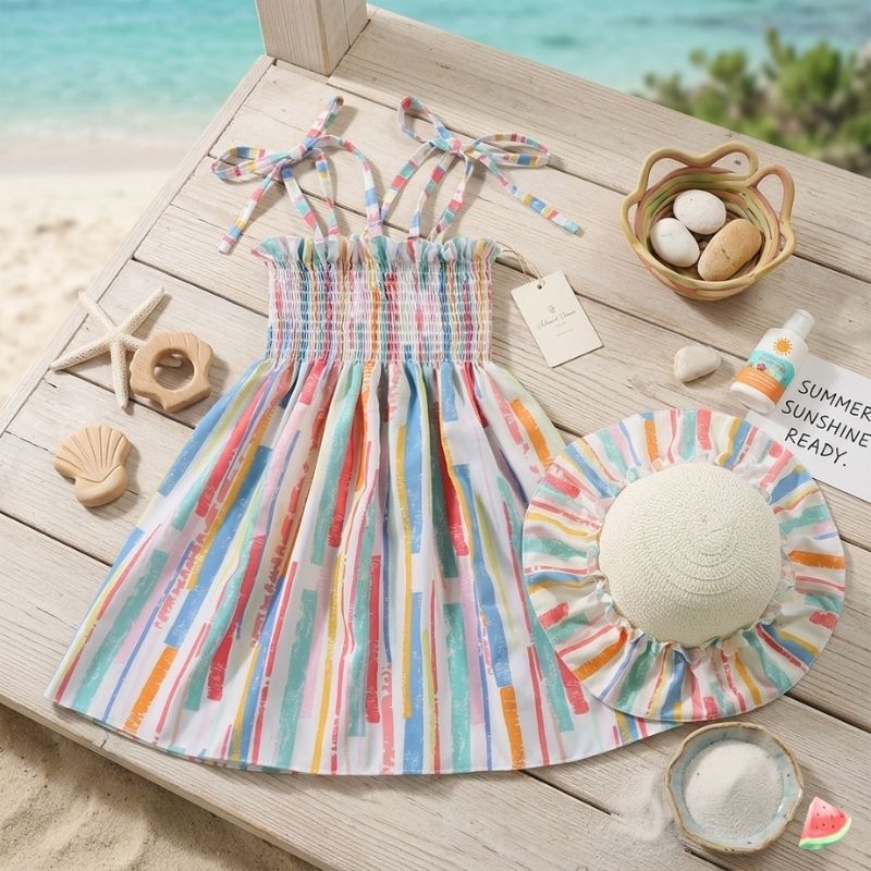 Babyonline(Y532) 2J7 (ส่งด่วน1วัน) ชุดกระโปรงแฟชั่นสายเดี่ยวแบบผูกพร้อมหมวกมีสายรัดคางสุดเก๋