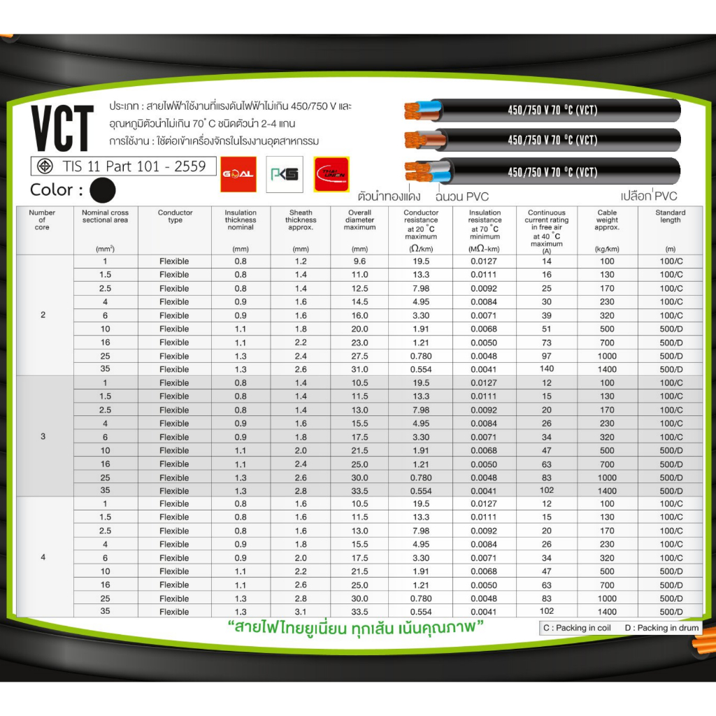 สายไฟ VCT THAI UNION 2x4 Sq.mm ฉนวน 2 ชั้น สายอ่อน ตัดแบ่งขาย 100 เมตร 50 เมตร 20 เมตร สายทองแดง มี มอก.