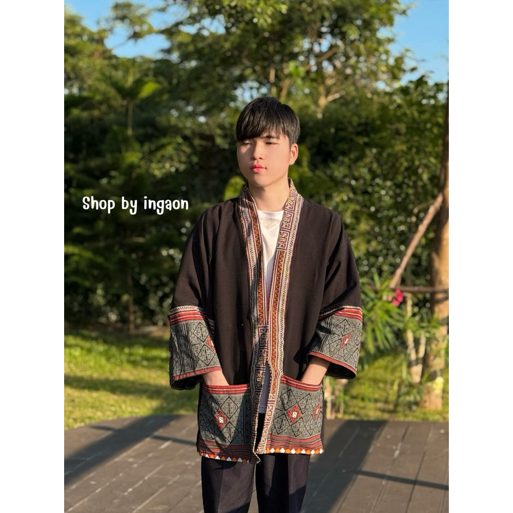 เสื้อคลุมยูกาตะ เสื้อคลุมพื้นเมือง(รุ่นพื้นสีดำ+เเต่งลายม้ง ทูโทน)ใส่ได้ทั้งผู้ชายเเละผู้หญิง Oversize