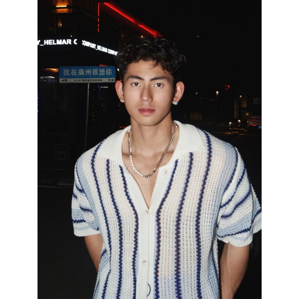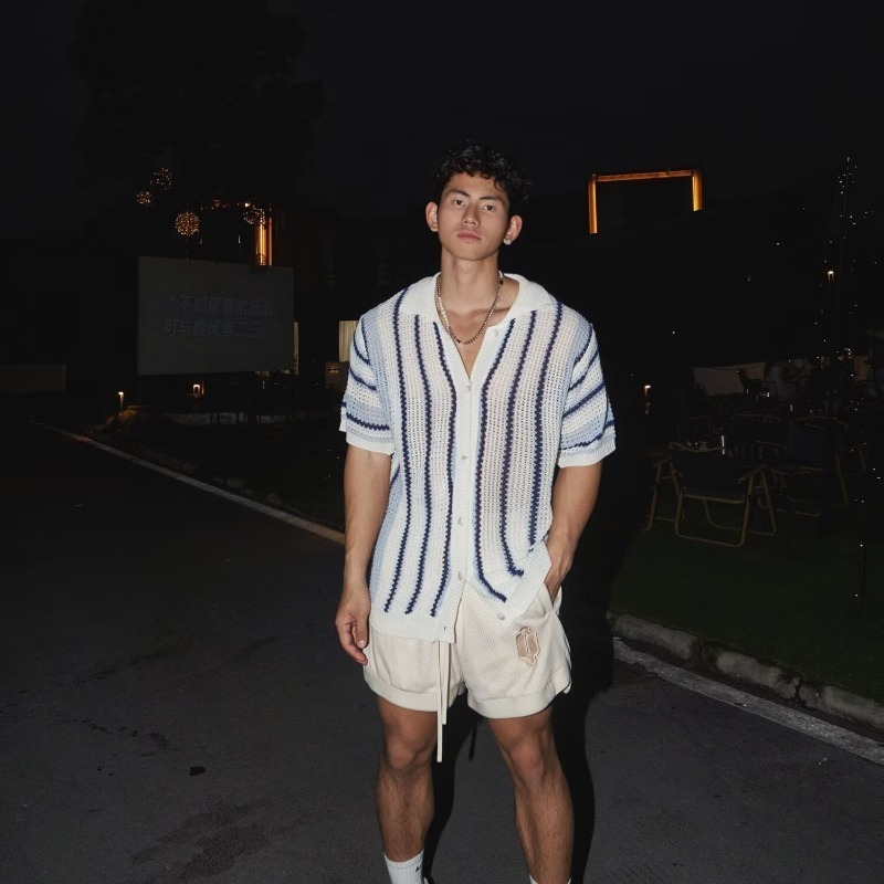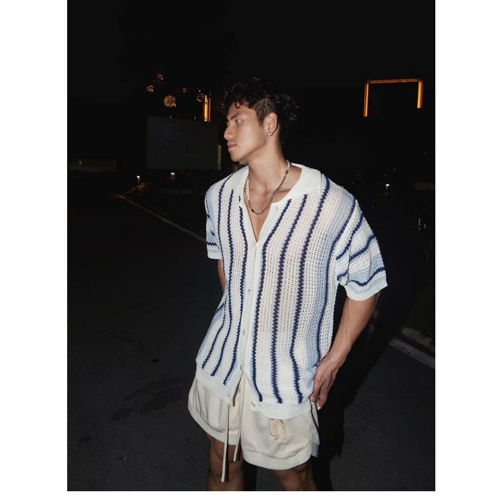 Houch พร้อมส่ง COD ผู้ชาย เสื้อถักแขนสั้นทรงหลวมลายทางอเมริกันพร้อมดีไซน์มินิมอลแบบตัดออก