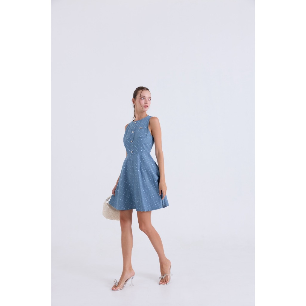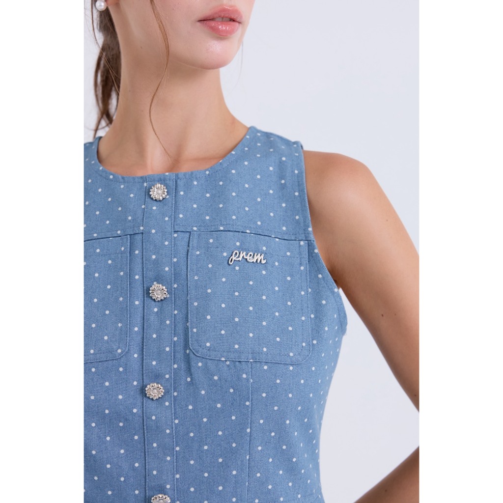 PREM เดรสโบกี้ ผ้ายีนส์ ลายจุด แต่งอะไหล่สีเงิน #552