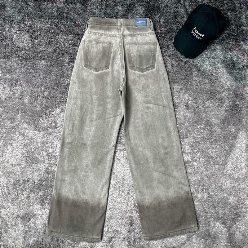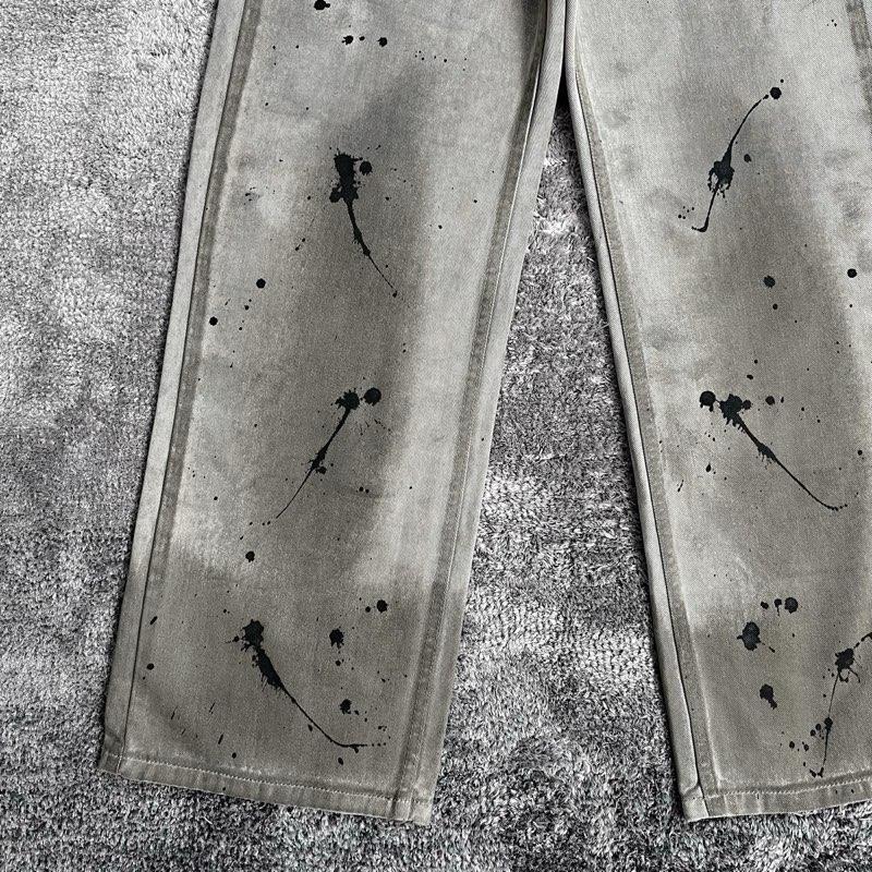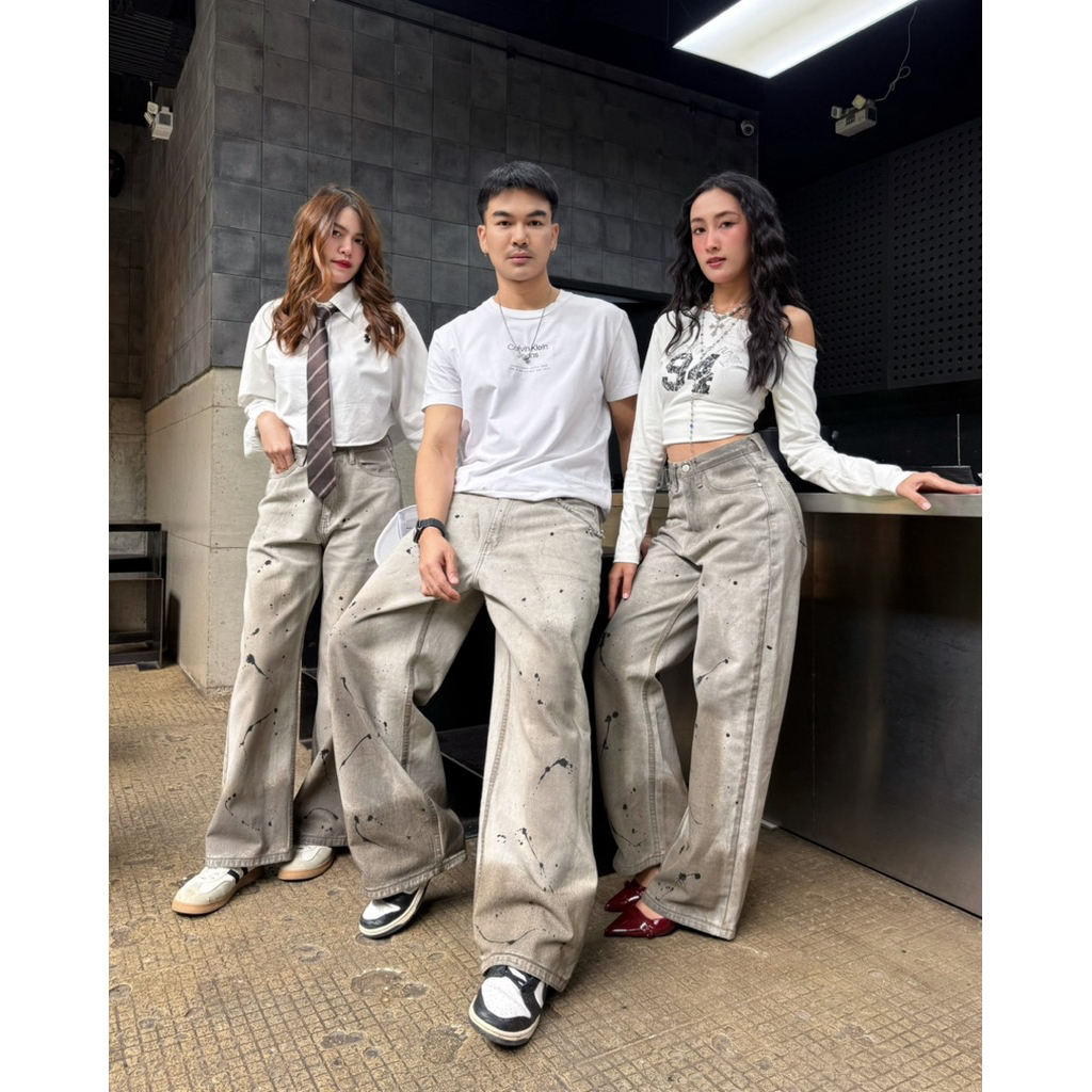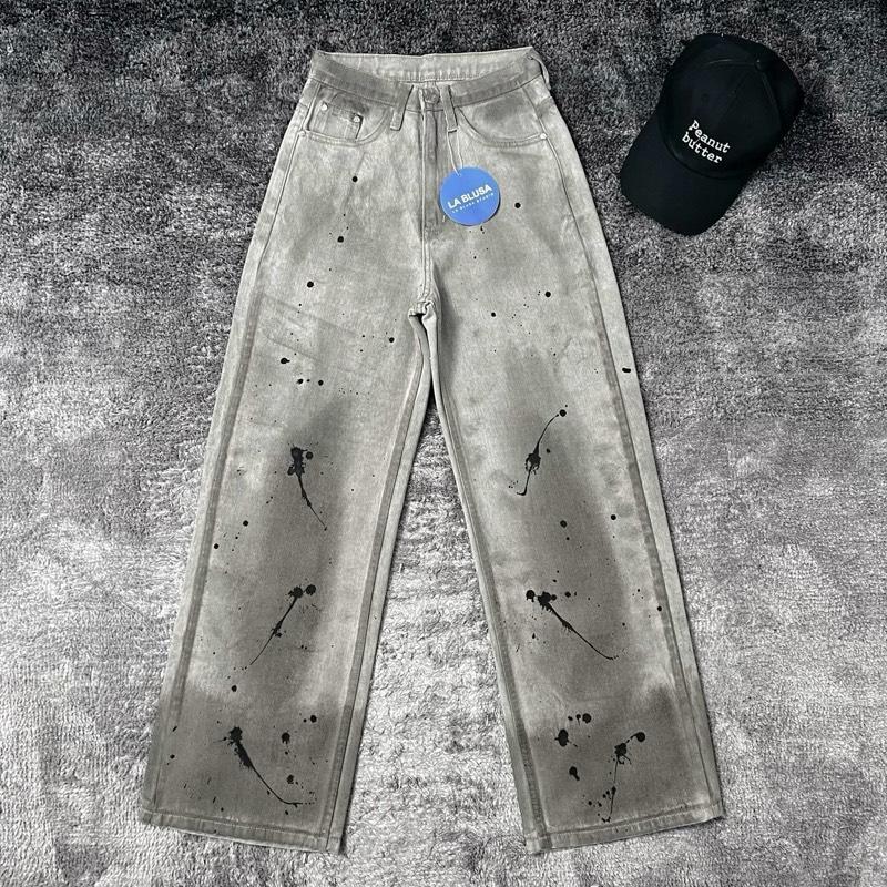 LABLUSA - LBS359 :กางเกงยีนส์ทรงกระบอกสีเทาแต่งเลอะเพนต์สาดสี สตรีทวินเทจ (Unisex)