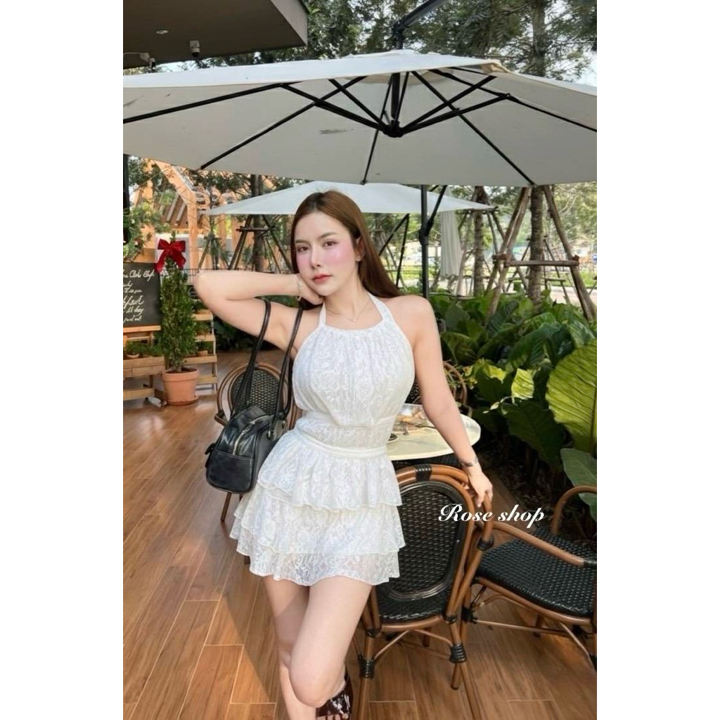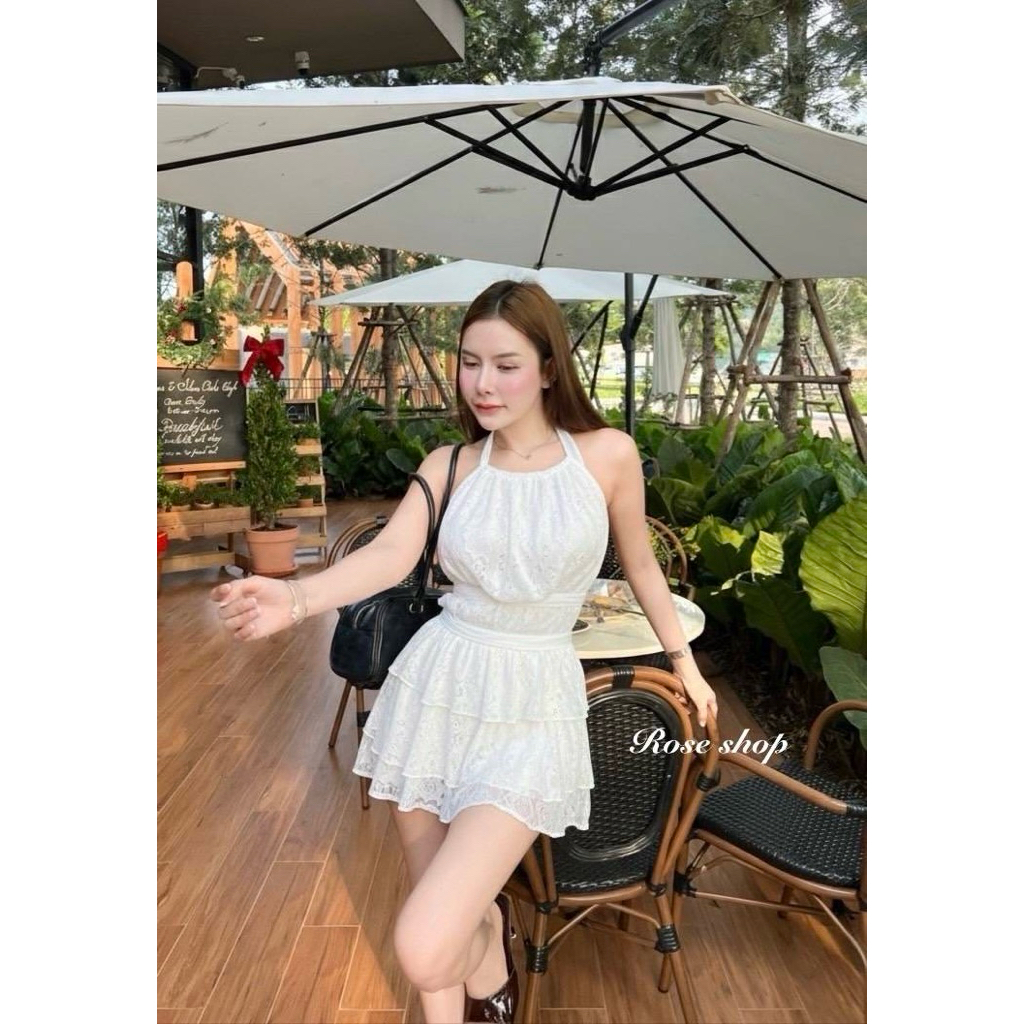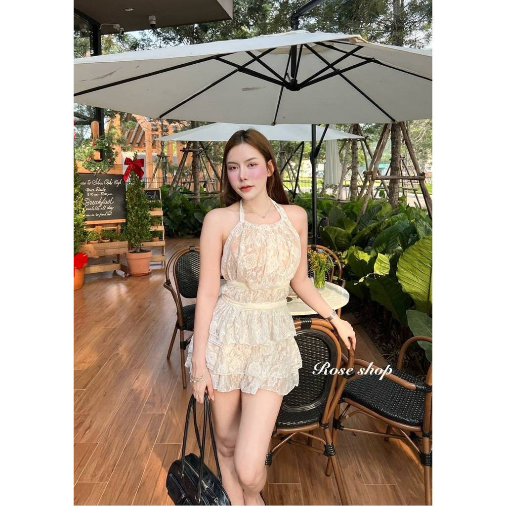Phapassz - Set2ชิ้น เสื้อคล้องคอเปิดหลัง กระโปรงทรงA ชายระบายชั้น มีซับในกางเกง #Roseshop