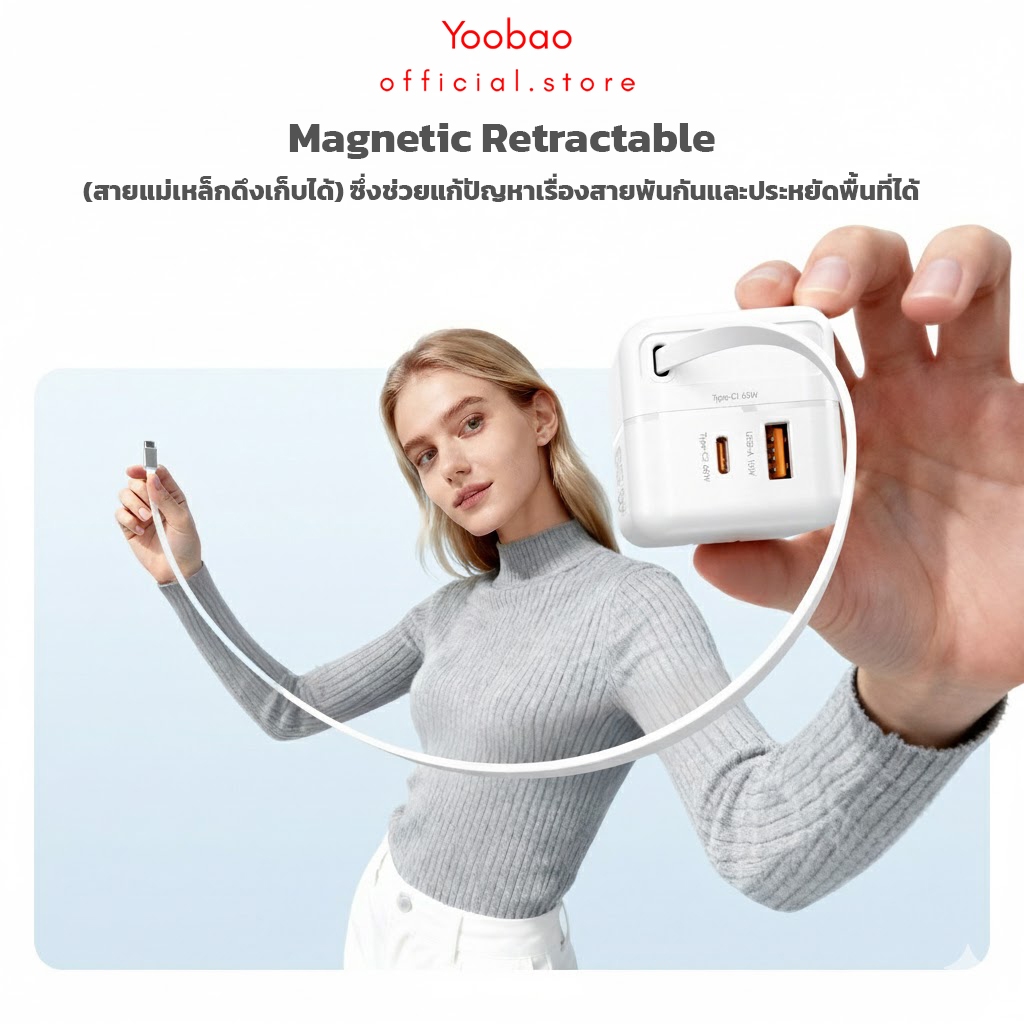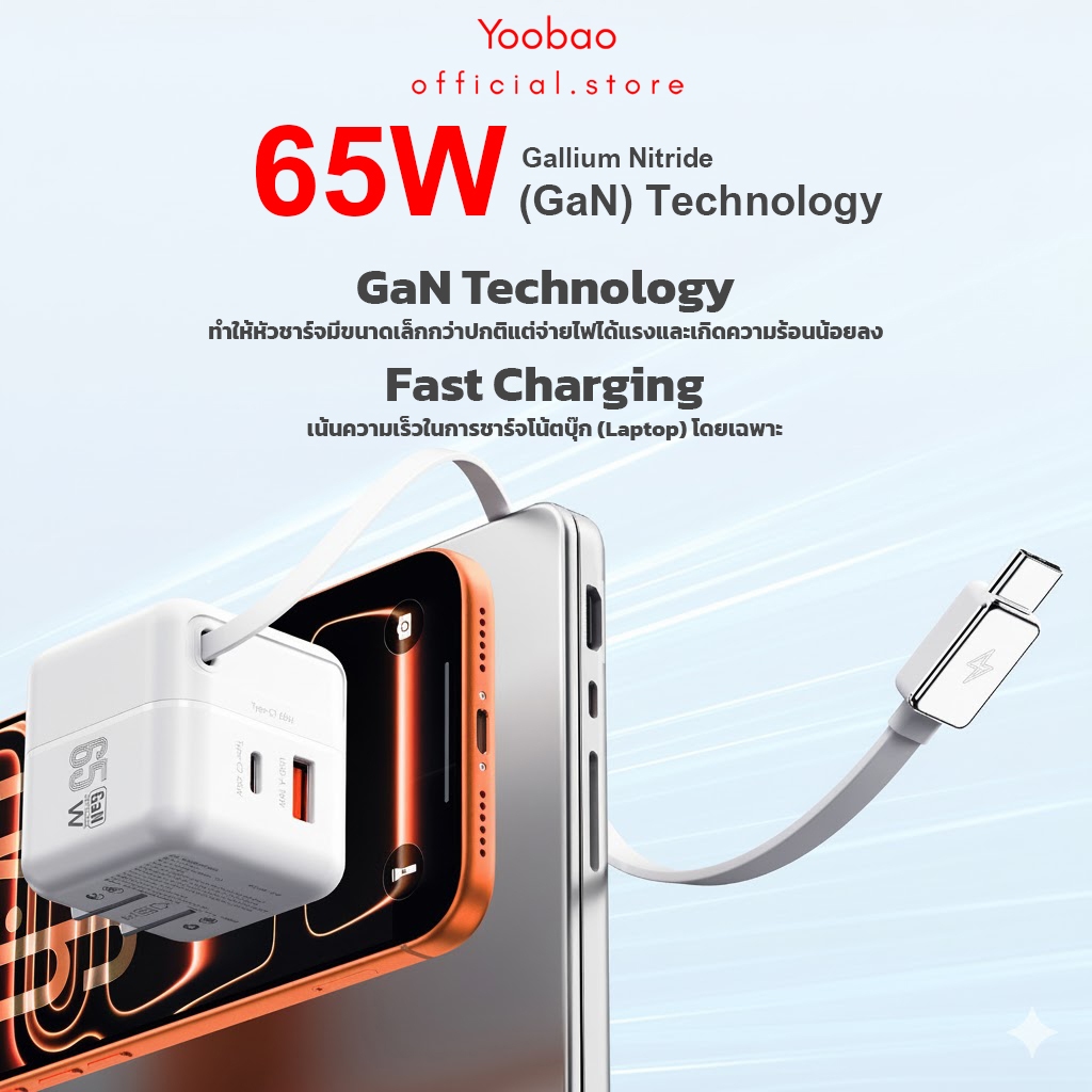 Yoobao Y-731AC 65W Gan อุปกรณ์ชาร์จ USB+Type-C PD3.0 QC 3.0 เครื่องชาร์จ AC สายType-Cในตัว