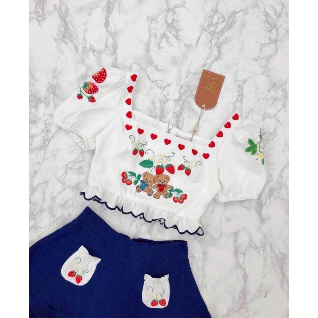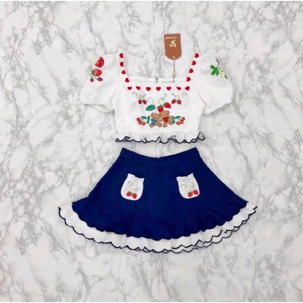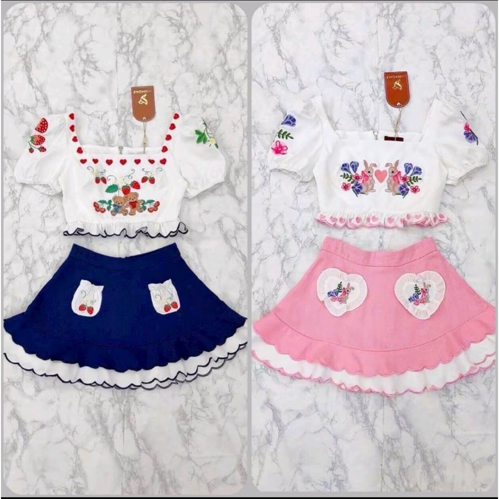 Setเสื้อคอปแขนพองสีขาวปักน้องหมี มาคู่กระโปรงสั้นแต่งระบายชายมีซับในกางเกง ป้าย missagale มือ1