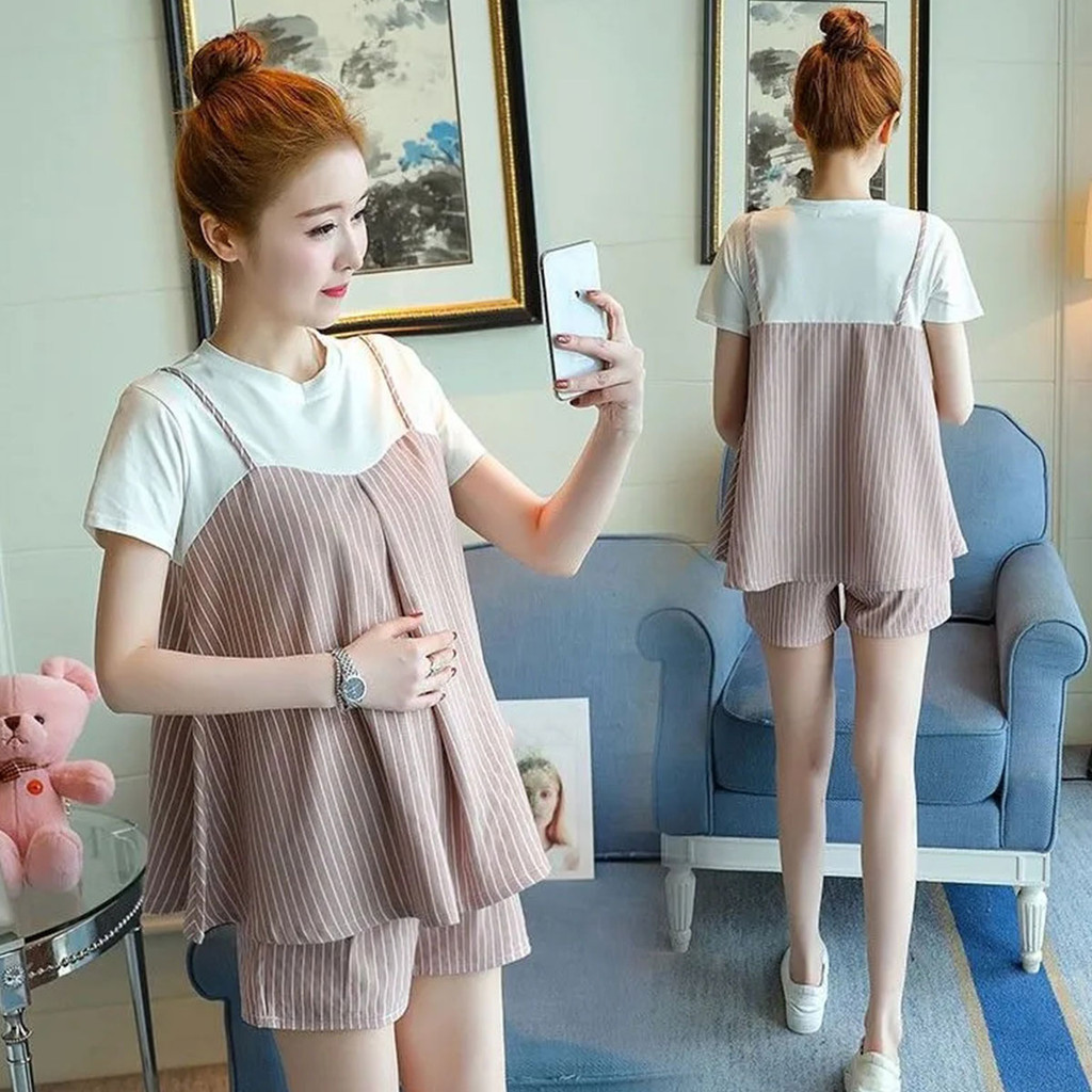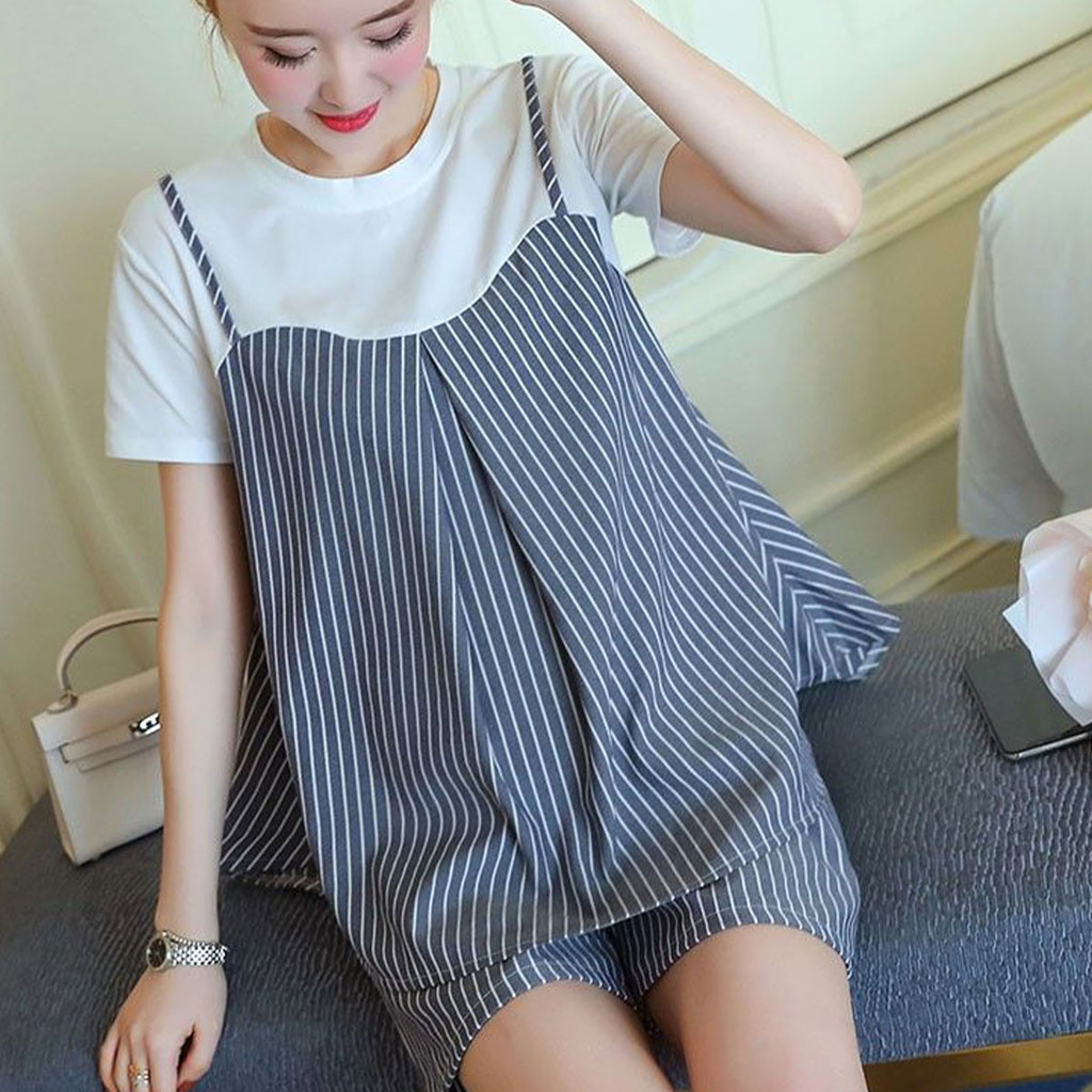 ชุดคลุมท้องลายทาง 2 ชิ้น แขนสั้น ทรงหลวม มีสไตล์และสวมใส่สบาย