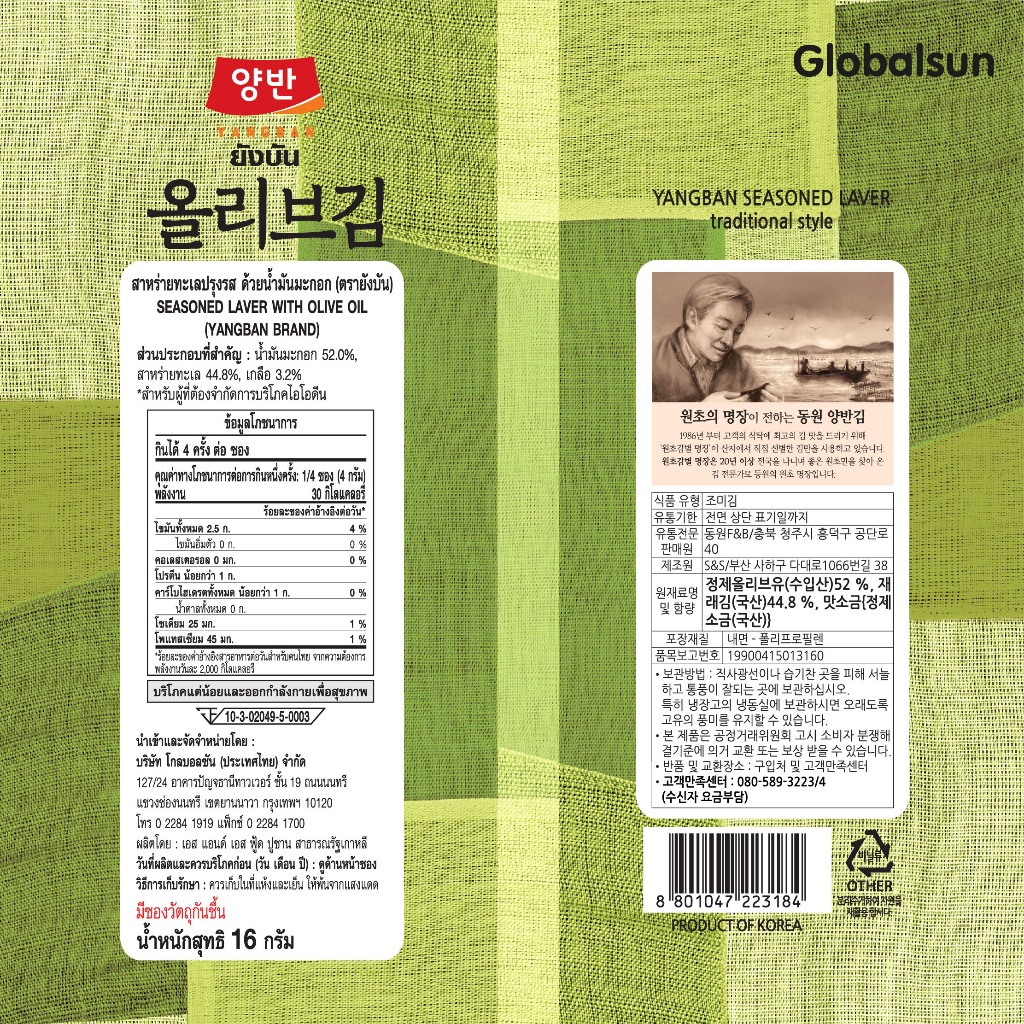 [โปรยกลัง แผ่นใหญ่] YANGBAN สาหร่ายทะเลปุงรสด้วยน้ำมันมะกอก (ตรายังบัน)