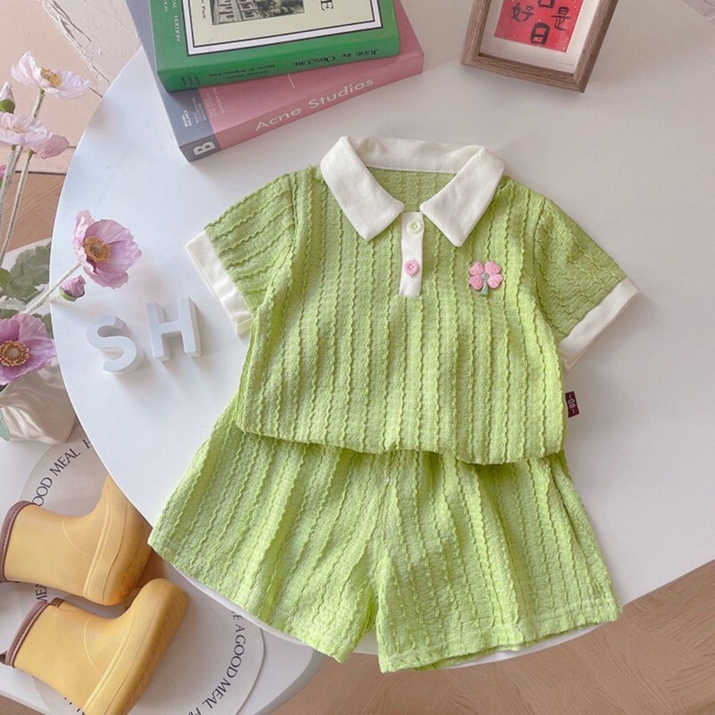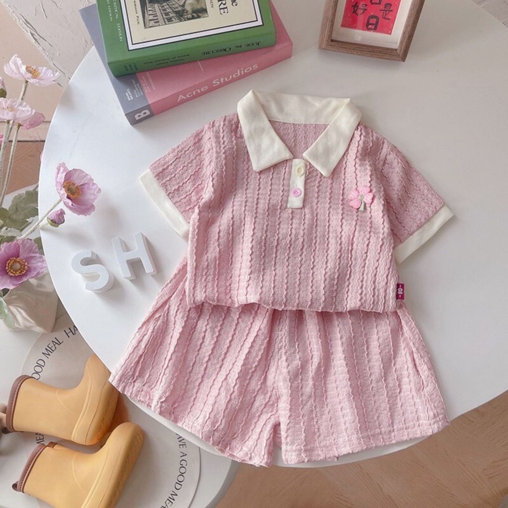 MooDeng Baby ชุดเสื้อโปโล สีชมพู สีม่วง สีเขียว มีลวดลาย สำหรับเด็กผู้หญิง กางเกงขาสั้น เสื้อแขนสั้น
