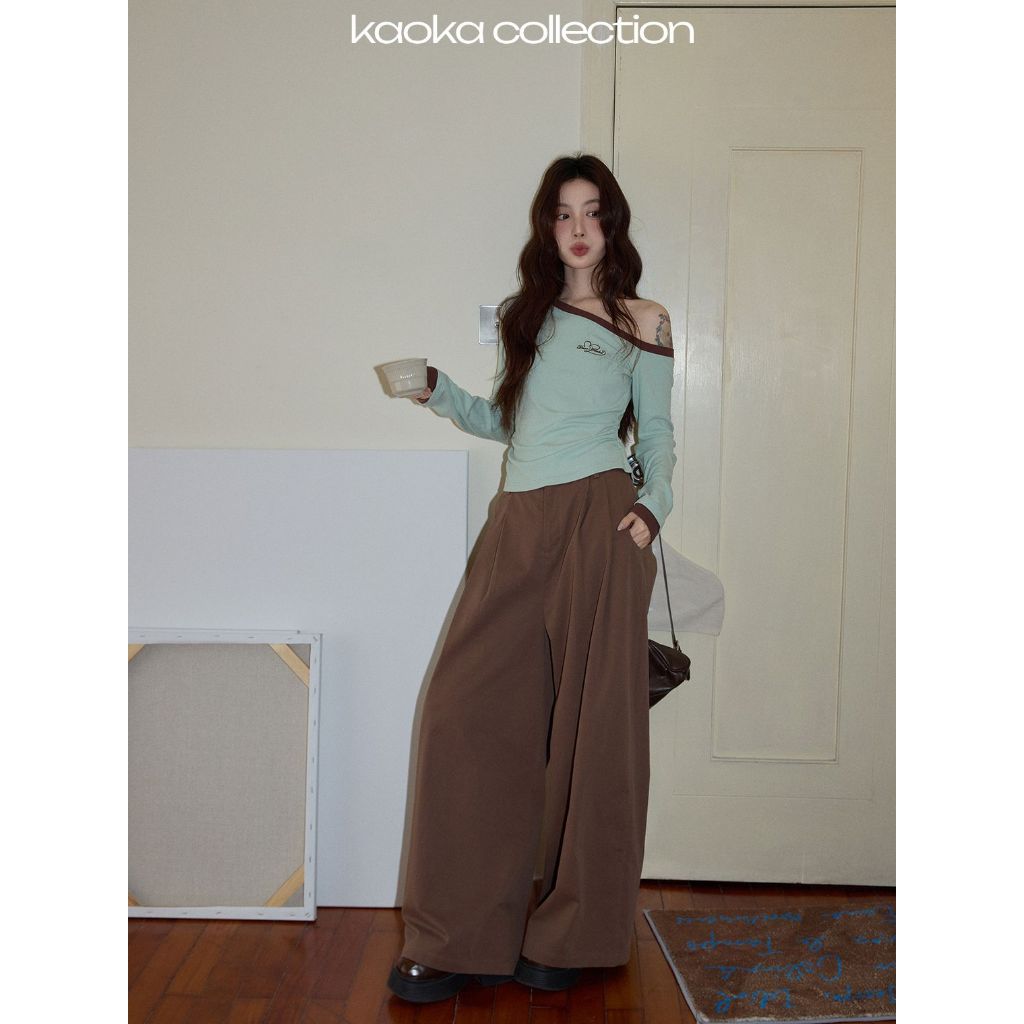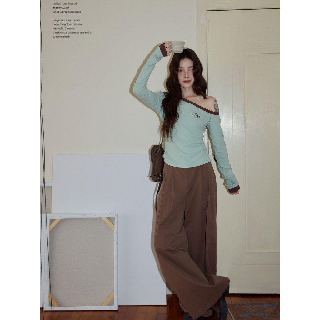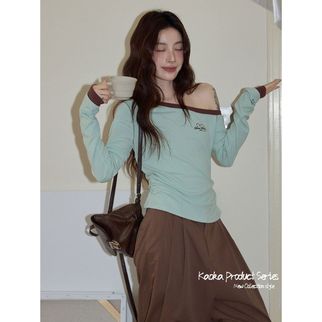 เสื้อยืดผู้หญิงสีเขียว ปิดไหล่ แขนยาวเฉียงSlim-Fit เอวกระชับ เหมาะสำหรับฤดูใบไม้ร่วง