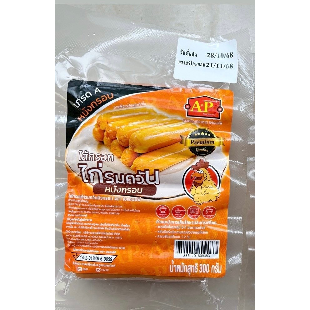แฟรงค์ไก่หนังกรอบ ตราA&P ขนาด 300 กรัม 13 ชิ้น ไส้กรอกไก่รมควันหนังกรอบ /แพ็คใส่เจลเย็น🧊 ทุกออเดอร์