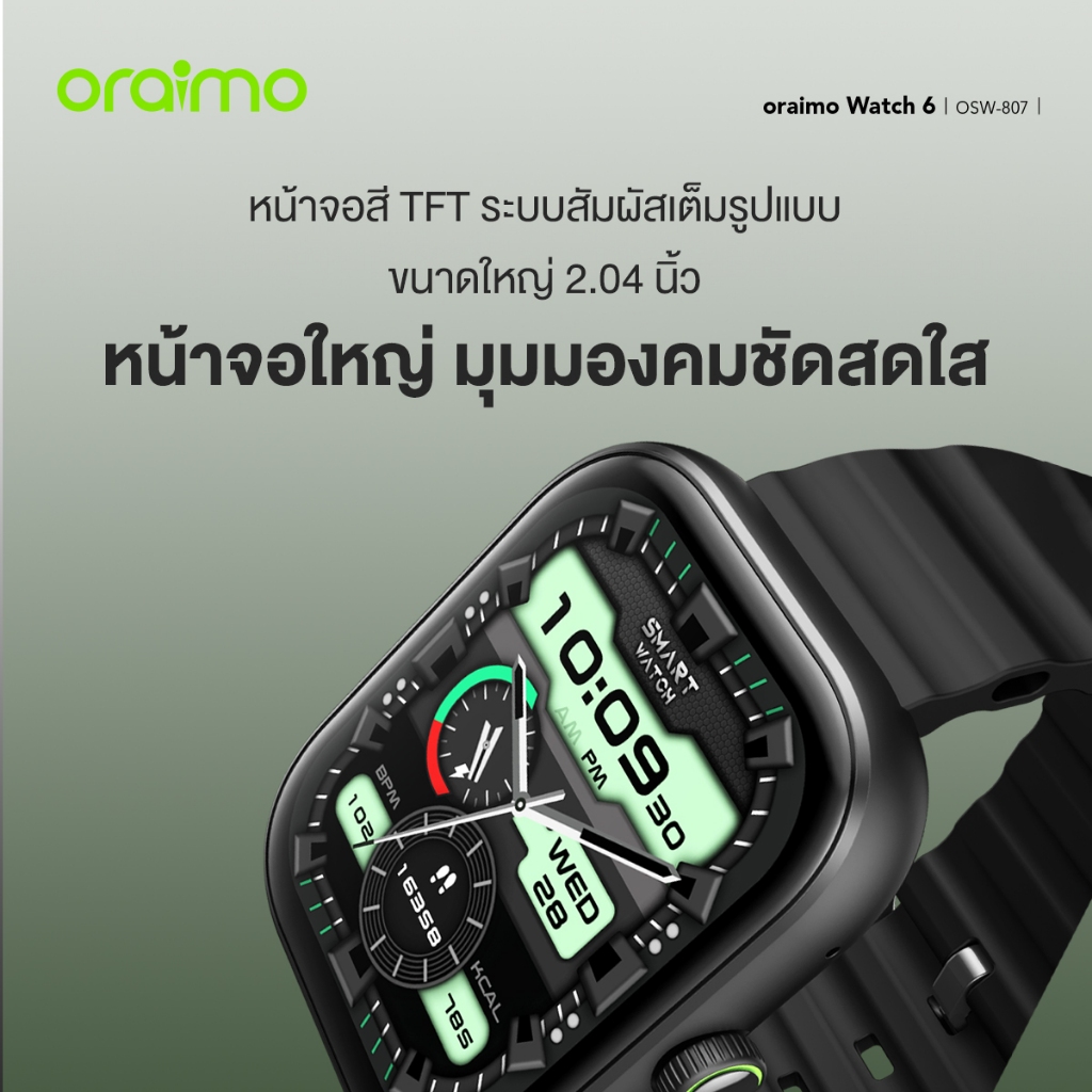 【ส่งทันที】oraimo Watch 6 OSW-807 นาฬิกาอัจฉริยะ Bluetooth โทรได้ จอใหญ่ 2.04” วัดชีพจร & SpO₂ โหมดกีฬา 105 แบต 8 วัน สแตนด์บาย 33 วัน กันน้ำ IP68 นาฬิกาออกกำลังกาย