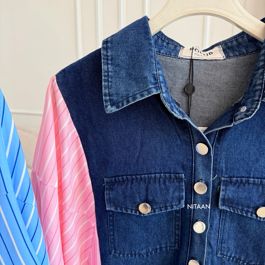 NITAAN เดรสยีนส์ ตัดต่อด้านข้างผ้าลายทาง สีสดใส กระดุมหน้า 🍇