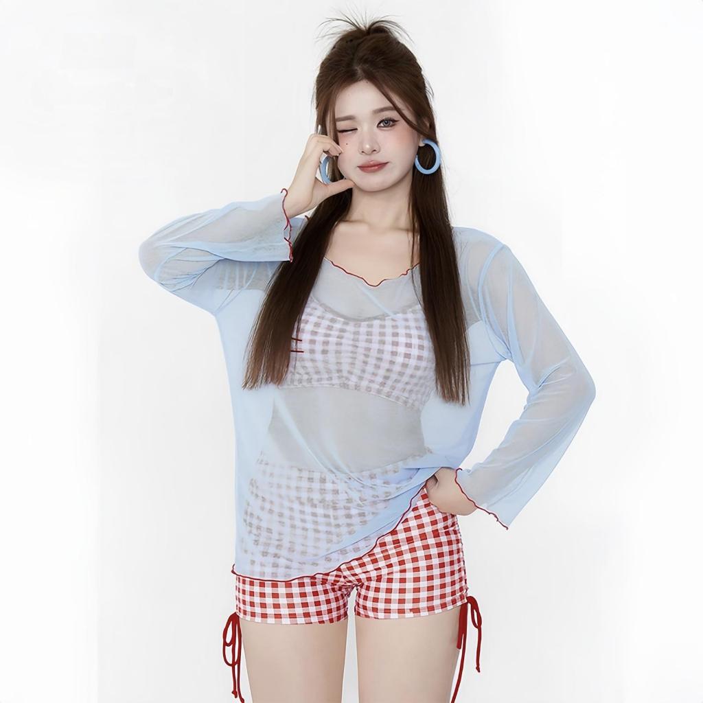 BLISS Ruby 3in1 Plus ชุดบิกินี่ลายสก๊อตสีฟ้าพร้อมชุดคลุมป้องกันแสงแดดแบบ Halter Neck Retro Style สำหรับผู้หญิง