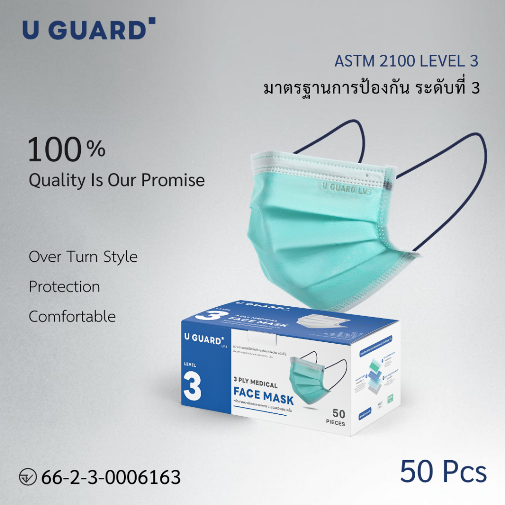 U GUARD Medical Face Mask หน้ากากอนามัยทางการแพทย์ Level 3 สีเขียวหูน้ำเงิน สายคล้องแบน ไม่รัดหู 50 ชิ้น/กล่อง