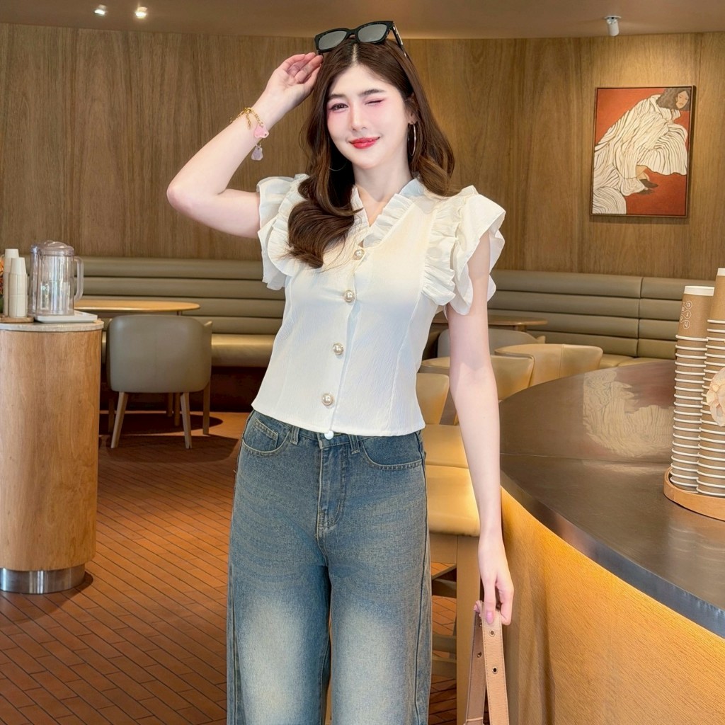เสื้อแฟชั่น ผ้าครัช คอแต่งระบาย แขนแต่งระบาย กระดุมมุกหน้า ทรงเข้ารูป สวเรียบหรู ใส่ทำงาน ใส่ออกงาน สายคาเฟ่ LG099